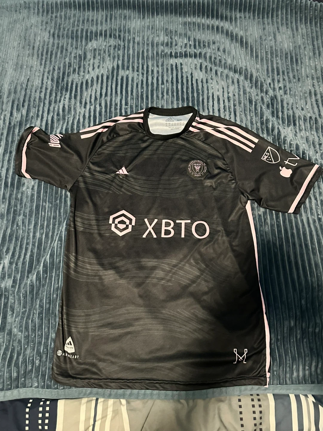 This is an Inter Miami CF soccer jersey featuring Lionel Messi's name and number 10 on the back. It's black with pink accents and Adidas branding. The front displays the XBTO sponsor logo.