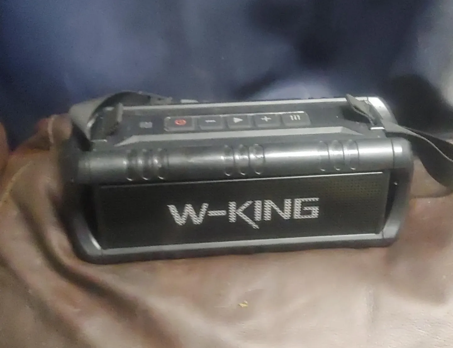 This is a W-KING portable speaker. It's black and has a strap for easy carrying. Controls are on top. It's great for on-the-go music! But there's no charger