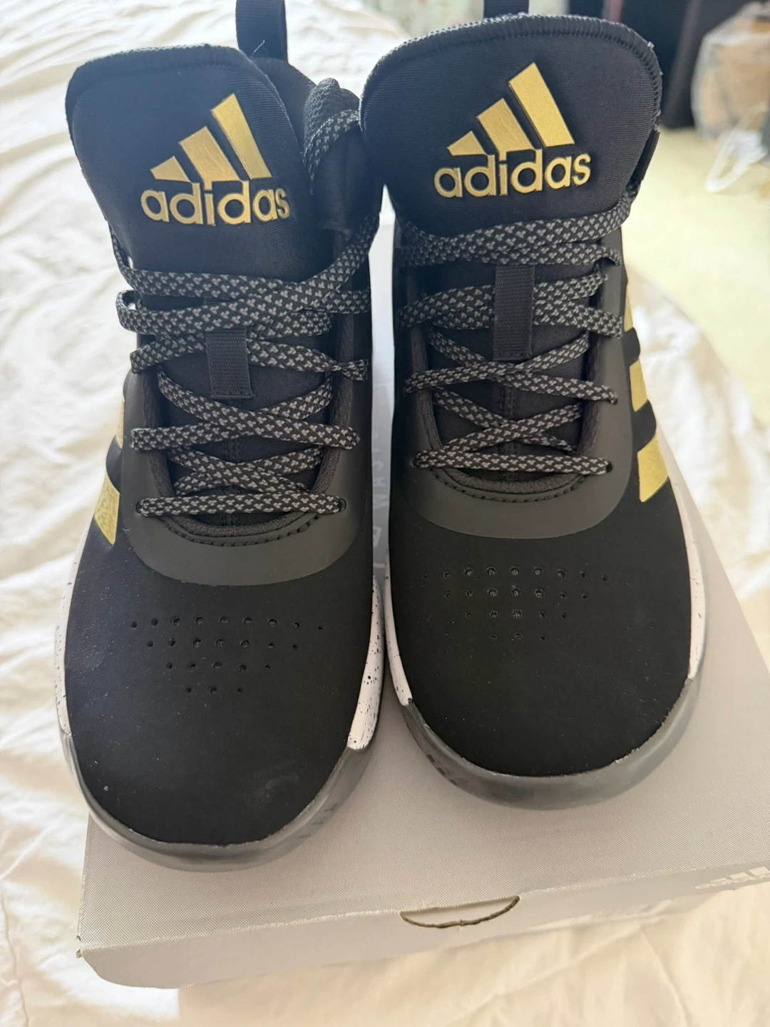 These Adidas basketball shoes are black with gold accents. They're a size 5 Wide (US). Includes original box.