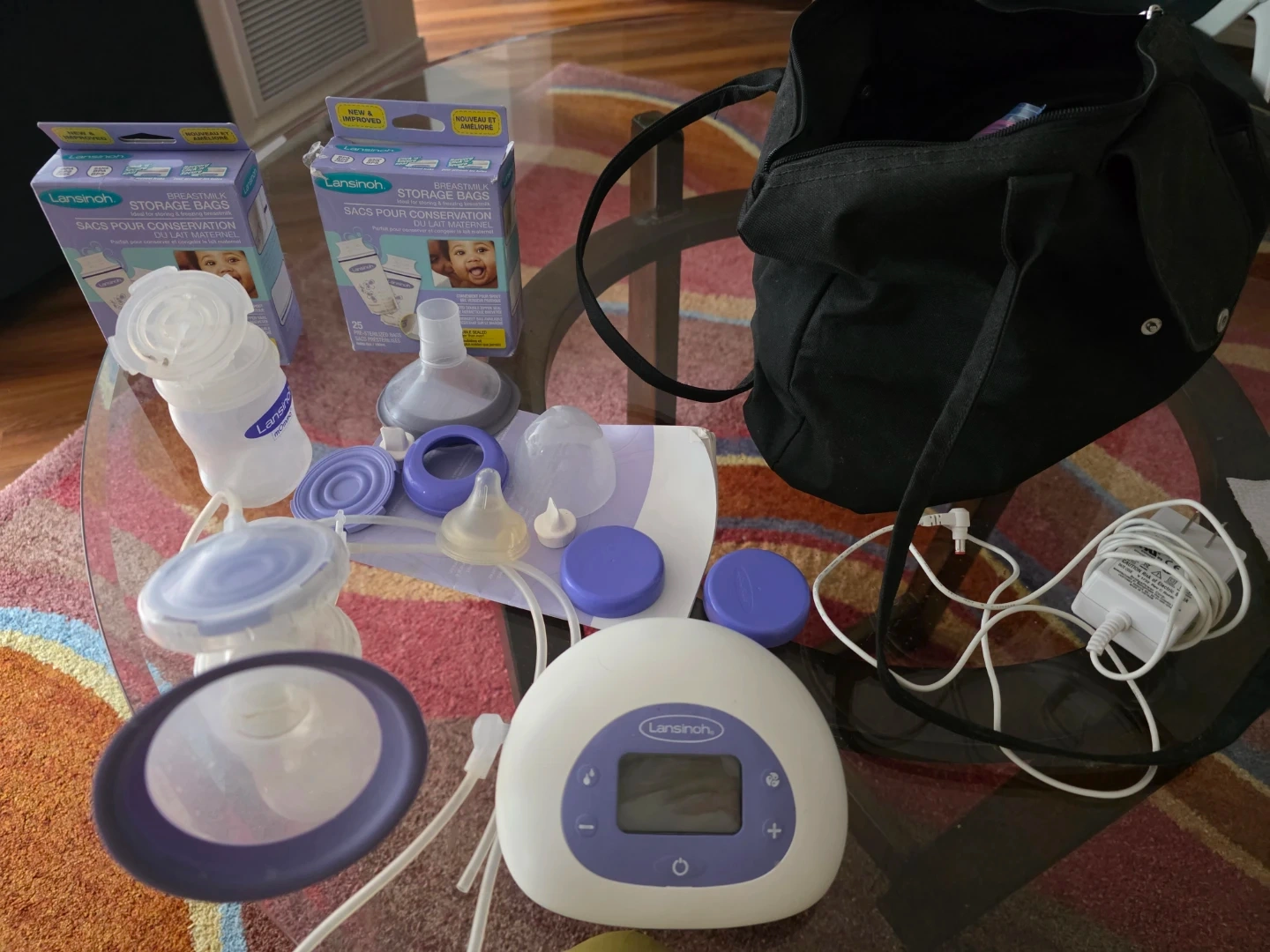 This Lansinoh double electric breast pump comes with all its accessories and two boxes of breast milk storage bags. It's designed for efficient milk expression. The pump is portable and includes a travel bag.