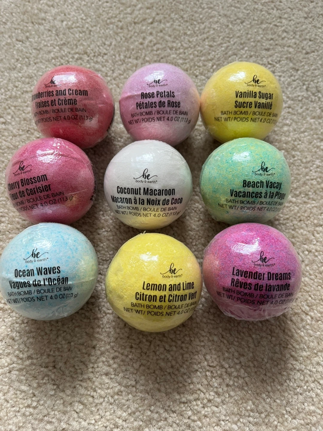 Body & Earth bath bombs in various scents: Strawberries and Cream, Rose Petals, Vanilla Sugar, Cherry Blossom, Coconut Macaroon, Beach Vacay, Ocean Waves, Lemon and Lime, and Lavender Dreams. Each bomb is 4.0 OZ (113 g).