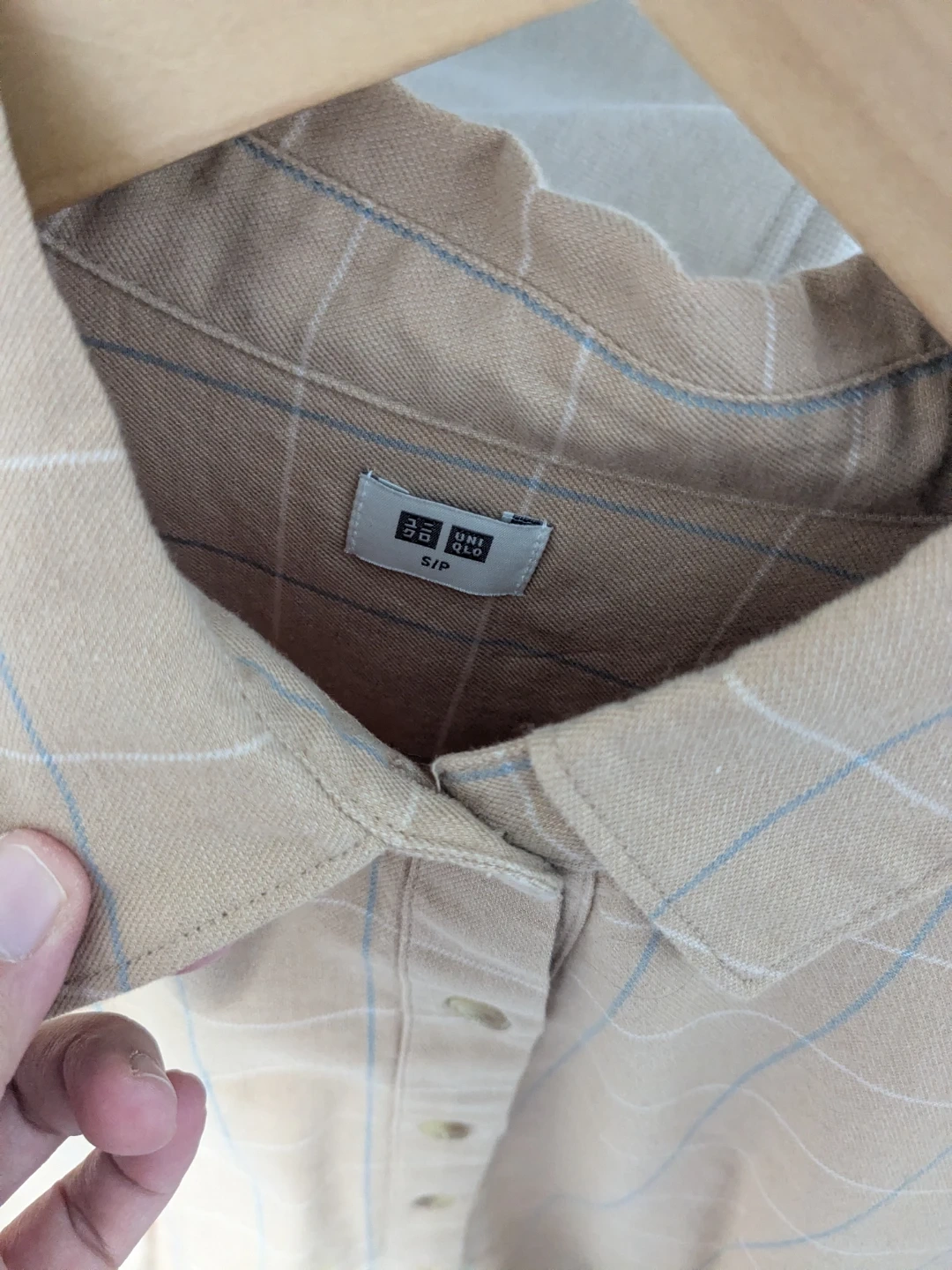 Uniqlo shirt. It's a size small and features a classic plaid pattern in neutral tones. Perfect for layering or wearing on its own!