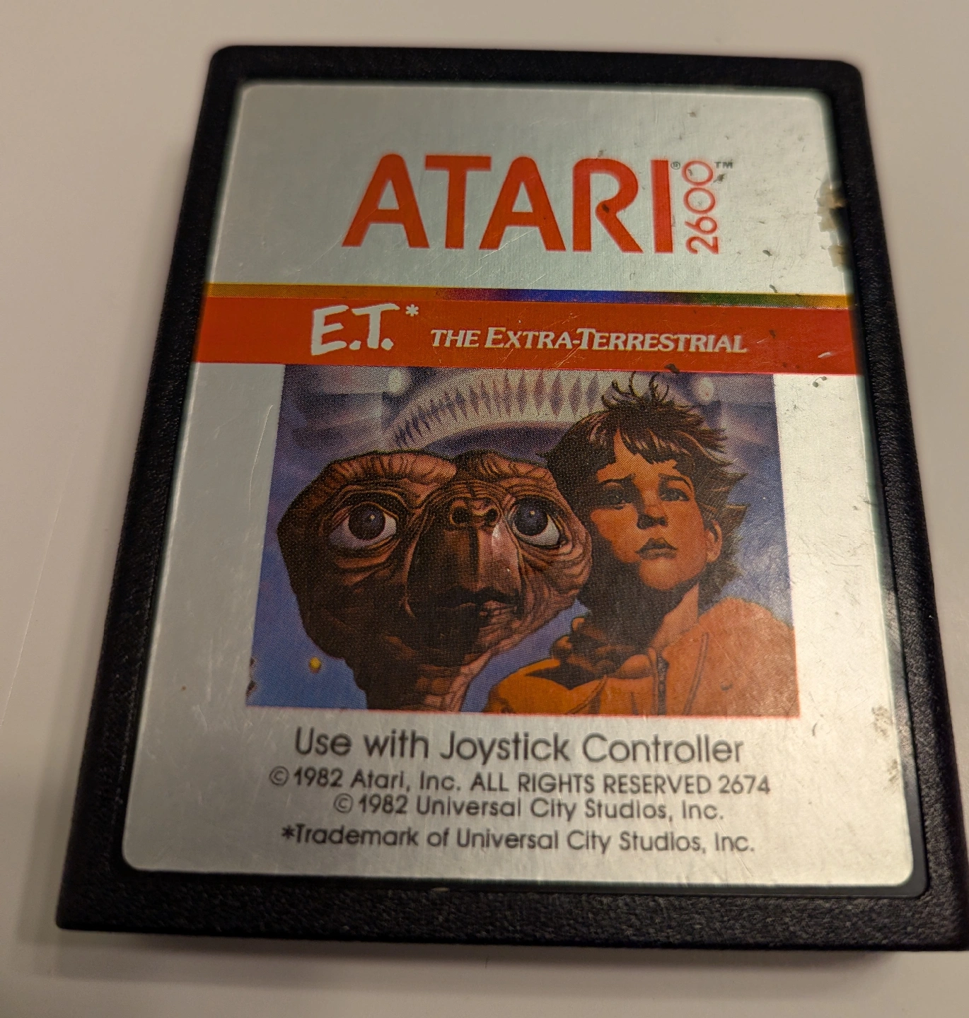 Selling an Atari 2600 game cartridge, E.T. the Extra-Terrestrial. Use with Joystick Controller. © 1982 Atari, Inc. All rights reserved. © 1982 Universal City Studios, Inc.