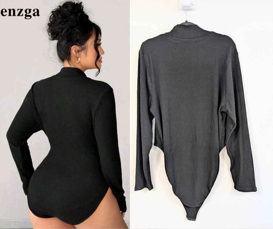 This is a brand new, never worn or washed, long-sleeve turtleneck leotard in black. It's made of fleece-ribbed material and comes with its original packaging. The reason for selling is that the size is too big.