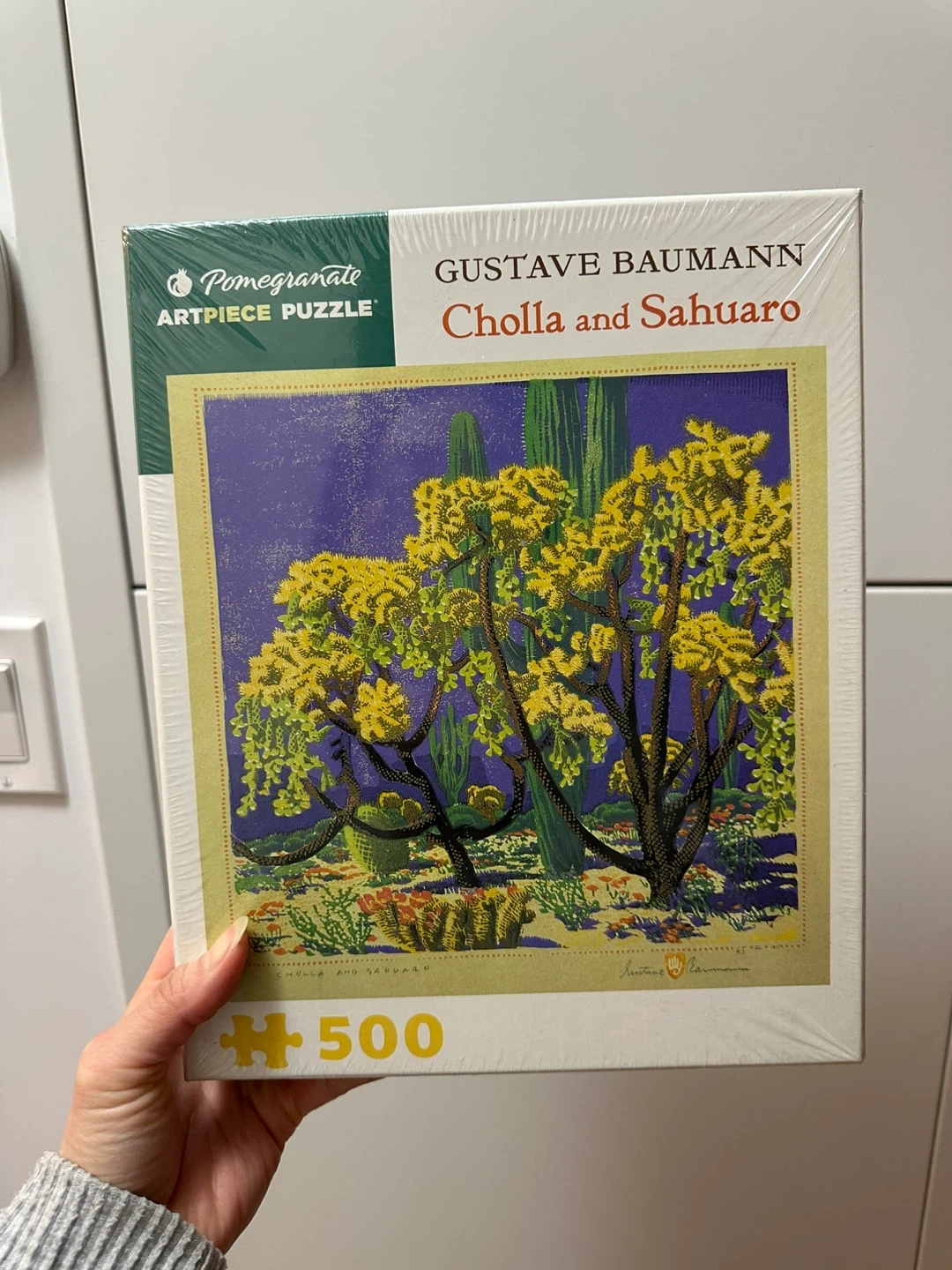 Pomegranate Artpiece Puzzle featuring Gustave Baumann's Cholla and Sahuaro painting. This is a 500-piece jigsaw puzzle. The completed puzzle size is 20.25in. x 26.5in. (50.8 cm x 67.3 cm). It's perfect for puzzle enthusiasts and art lovers alike!
