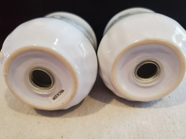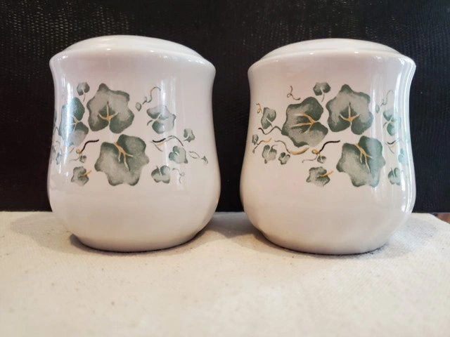 A pair of salt & pepper shakers in the Callaway Ivy pattern. These are Corelle Coordinates, matching the Corning Ware line. The shakers are stoneware, with the plugs at the bottom and stand just under 3" tall. They're in great shape - $15.00, pick up only