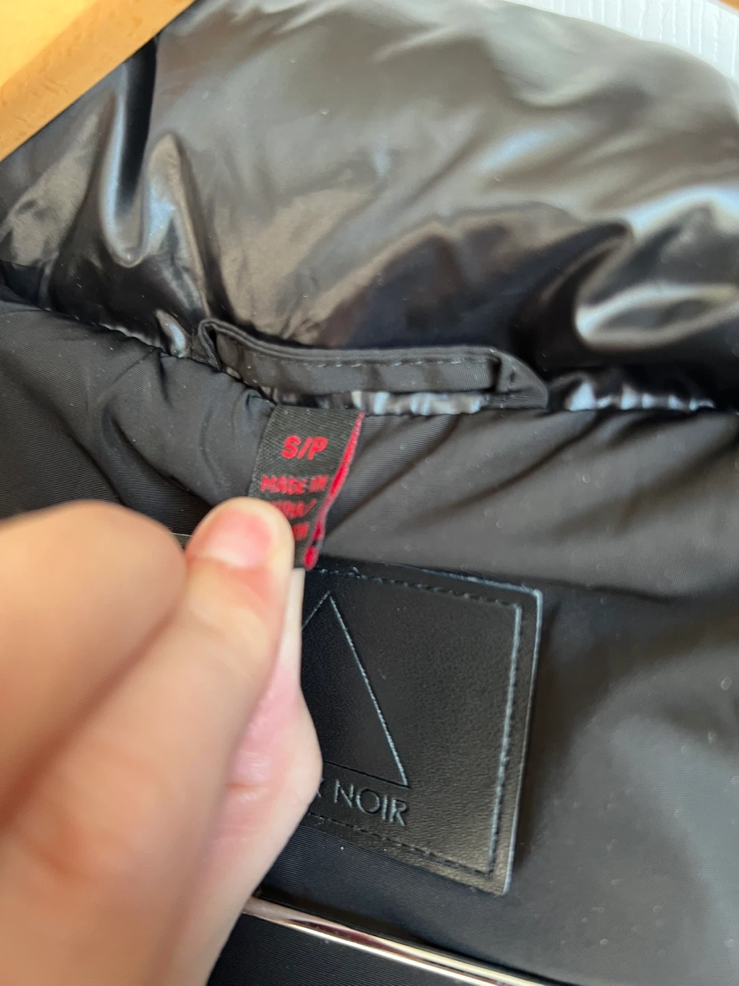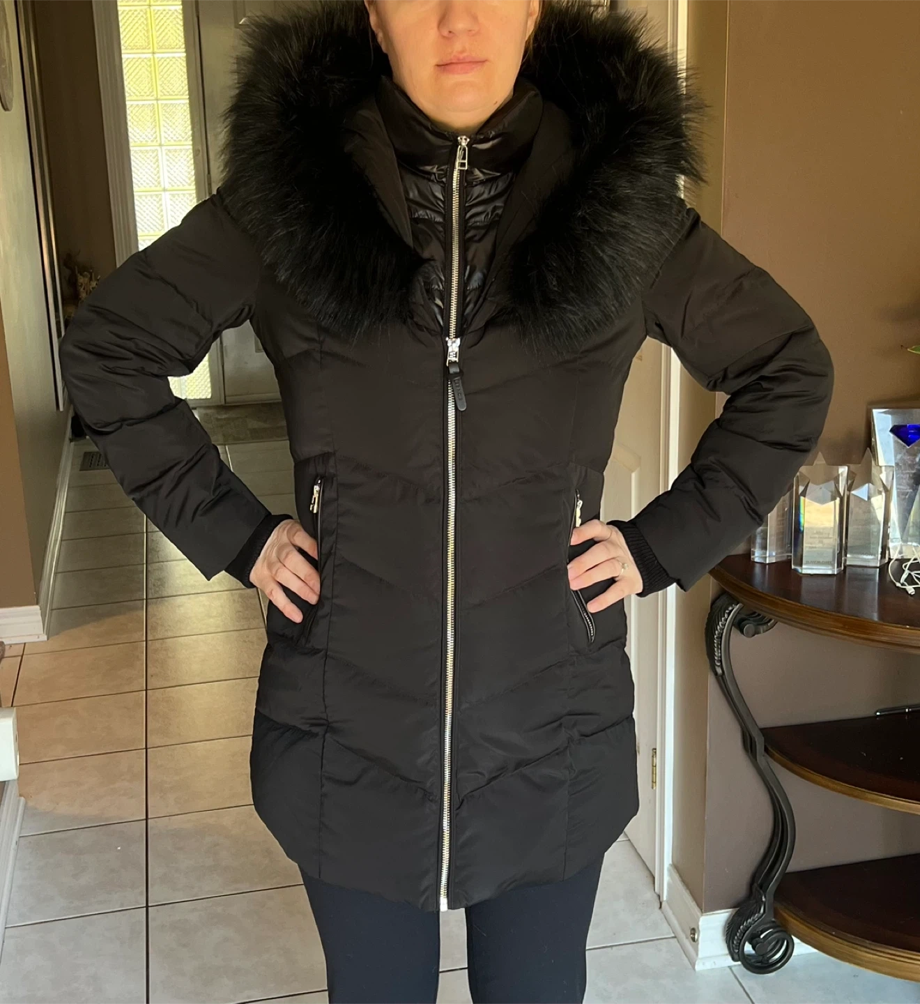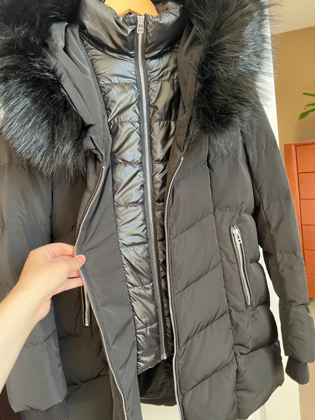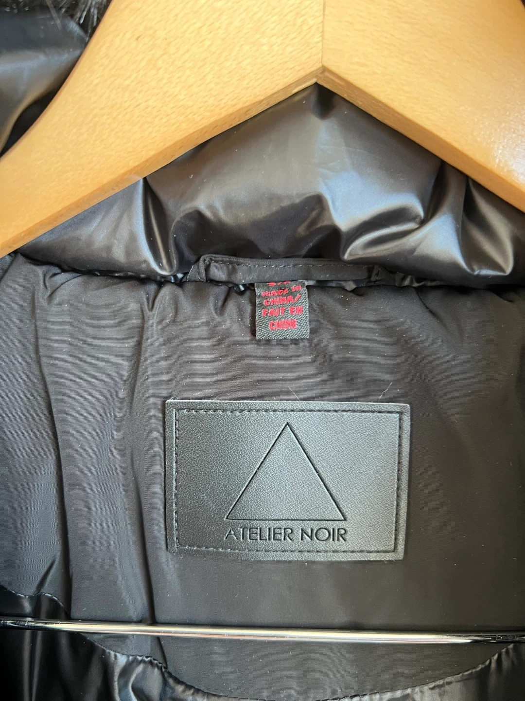 Stay warm this winter with this stylish Atelier Noir down-filled coat! It features a faux fur-trimmed hood and a sleek black design. Perfect for those chilly Canadian days!