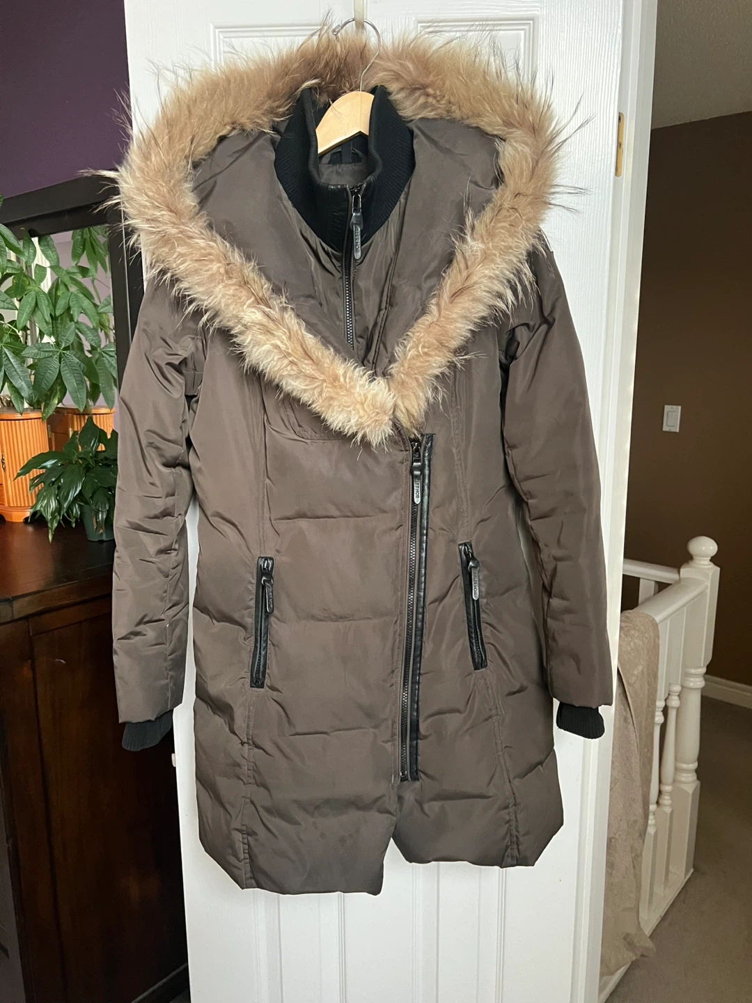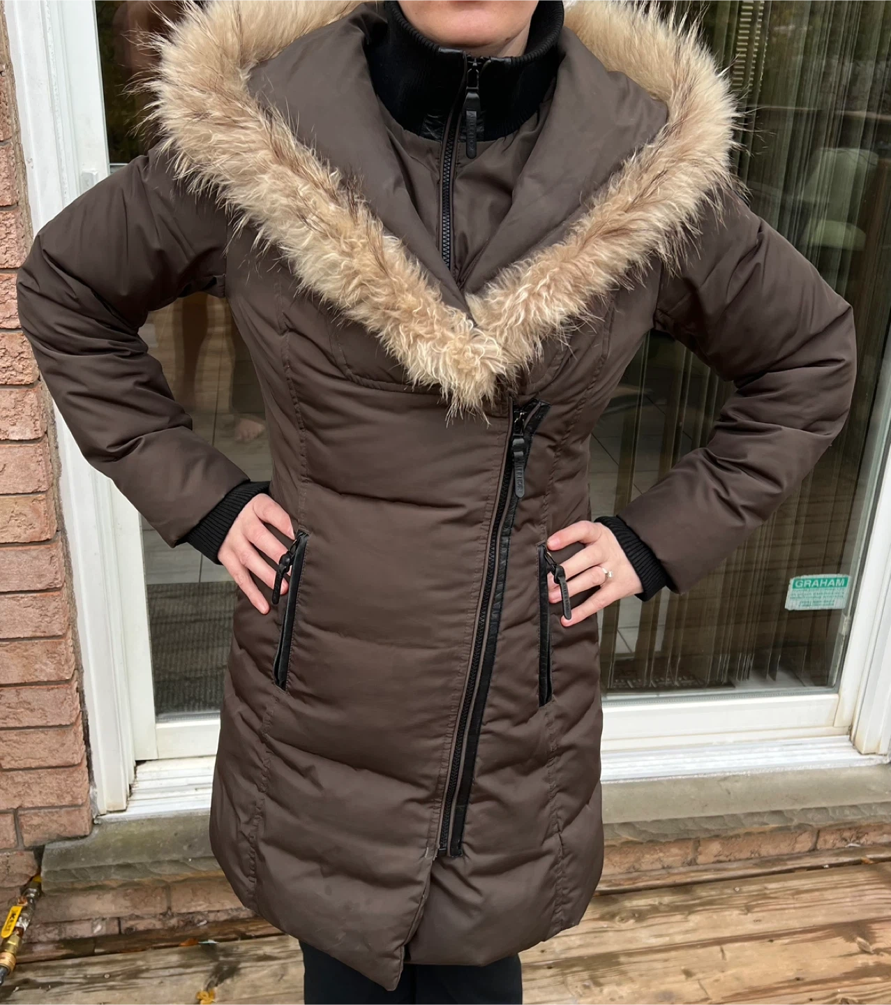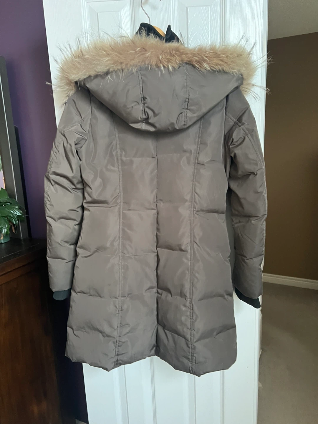 86Cozy Atelier Noir down parka in a nice neutral colour. It has a faux fur trim, and is super warm and stylish for the winter months! Size is M.