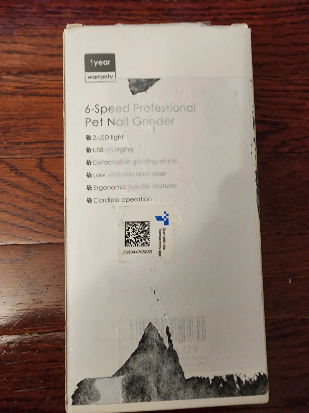 This is a 6-speed professional pet nail grinder with 2-LED light. It features USB charging, a detachable grinding wheel, low vibration and noise, ergonomic handle features, and cordless operation. It takes 3 hours to charge and provides 3 hours of use.