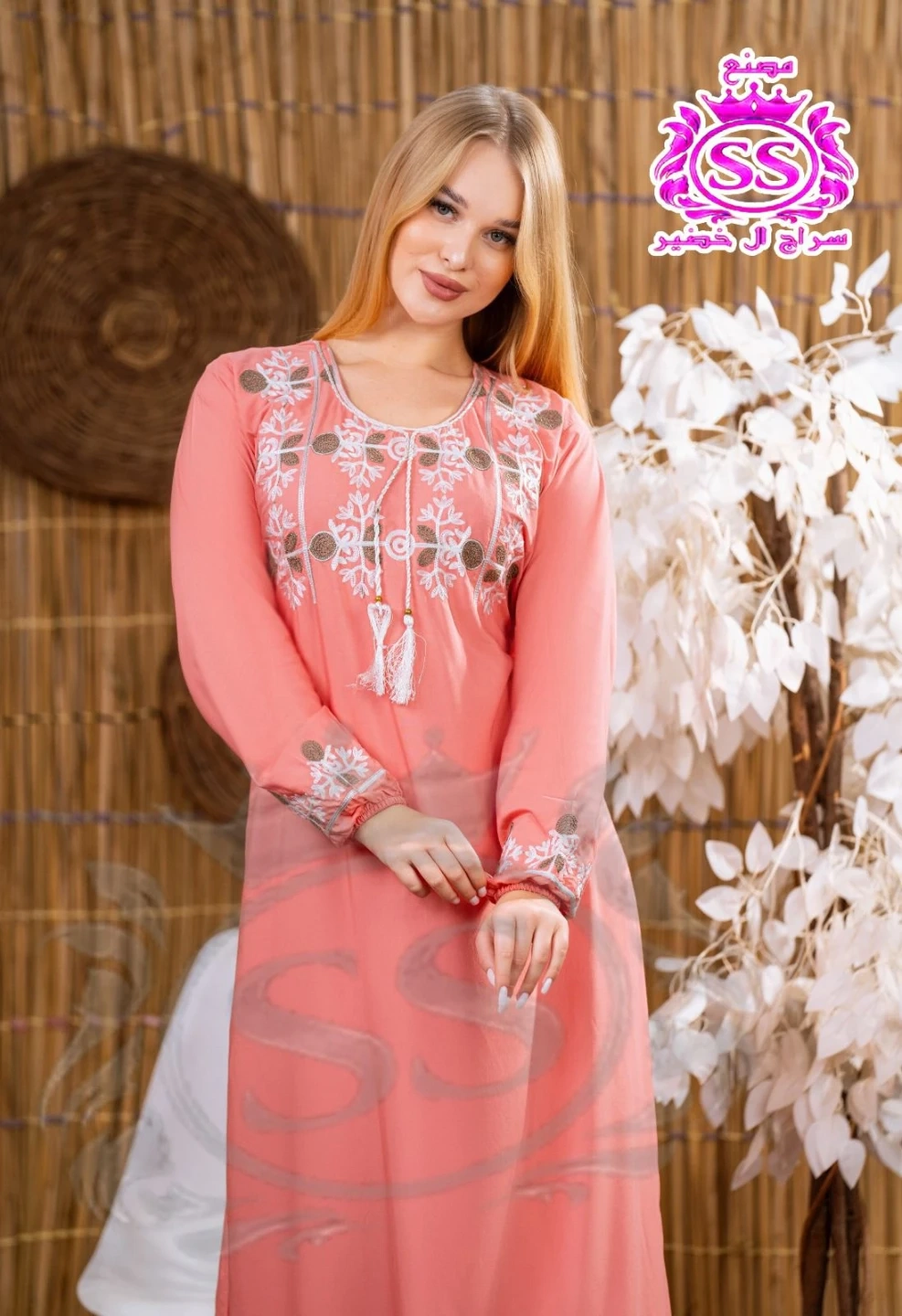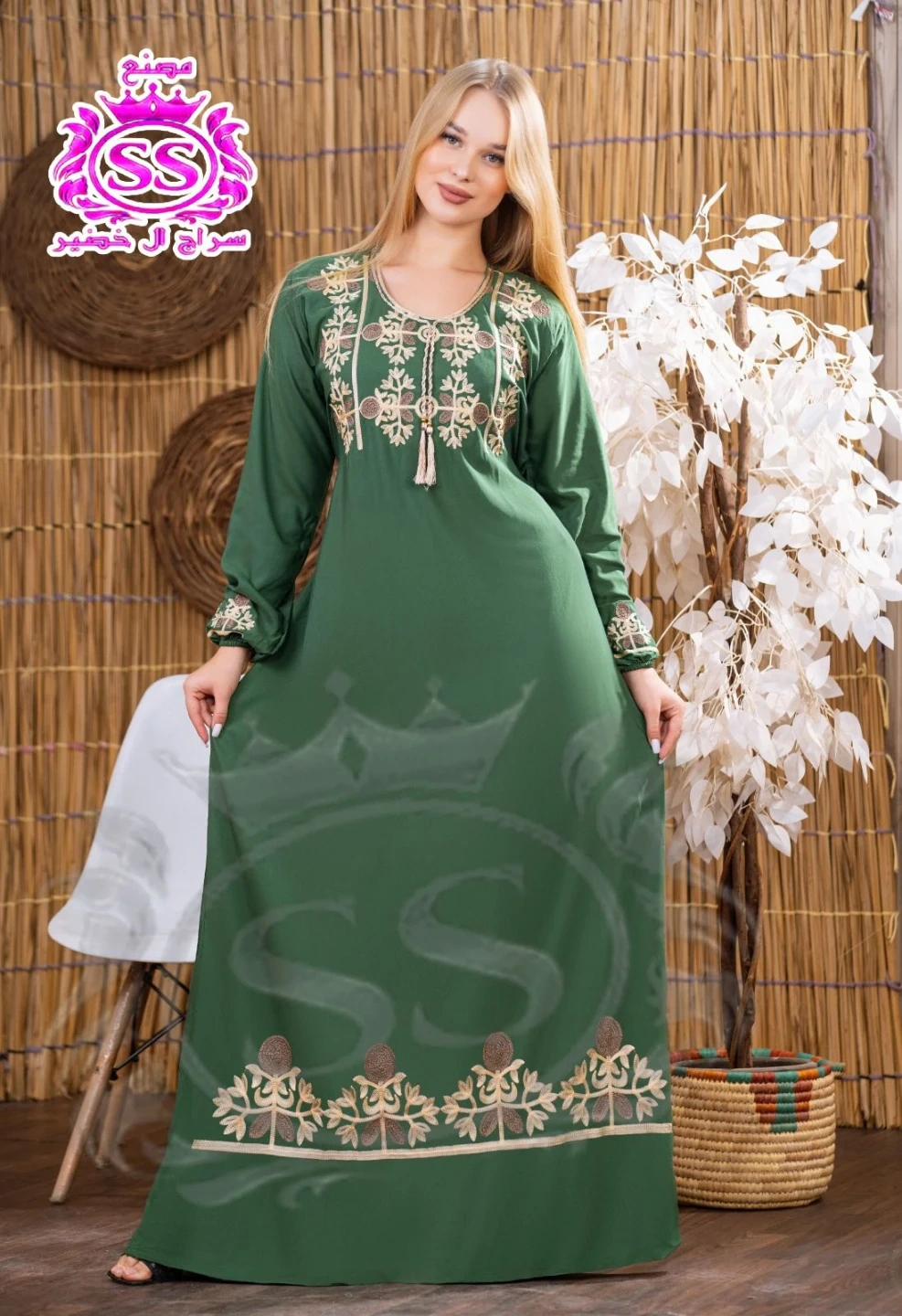 Flowy, long-sleeved kaftan dress with intricate gold embroidery. Features a v-neckline with tassel detail. Available in multiple colours. Perfect for special occasions or everyday elegance!