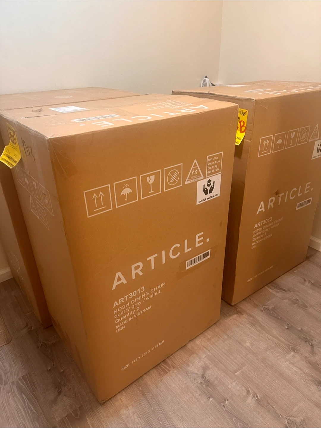 Selling a set of 6 Article Nosh dining chairs! They feature a cozy gray fabric and a walnut wood frame. The chairs are New in the box, and ready to add a touch of modern style to your dining space. The size of each chair is 745 x 555 x 1135 mm. Boxes included