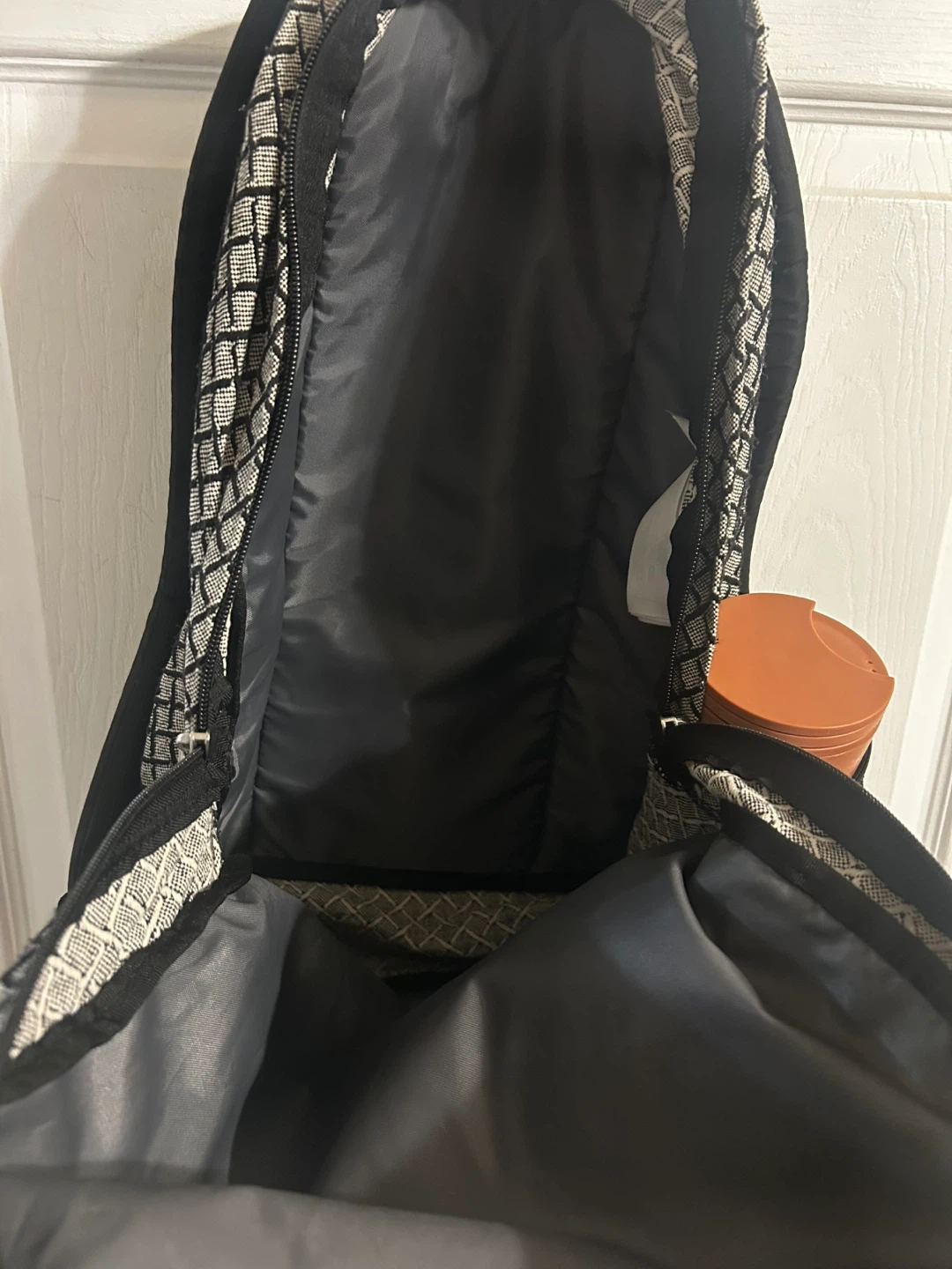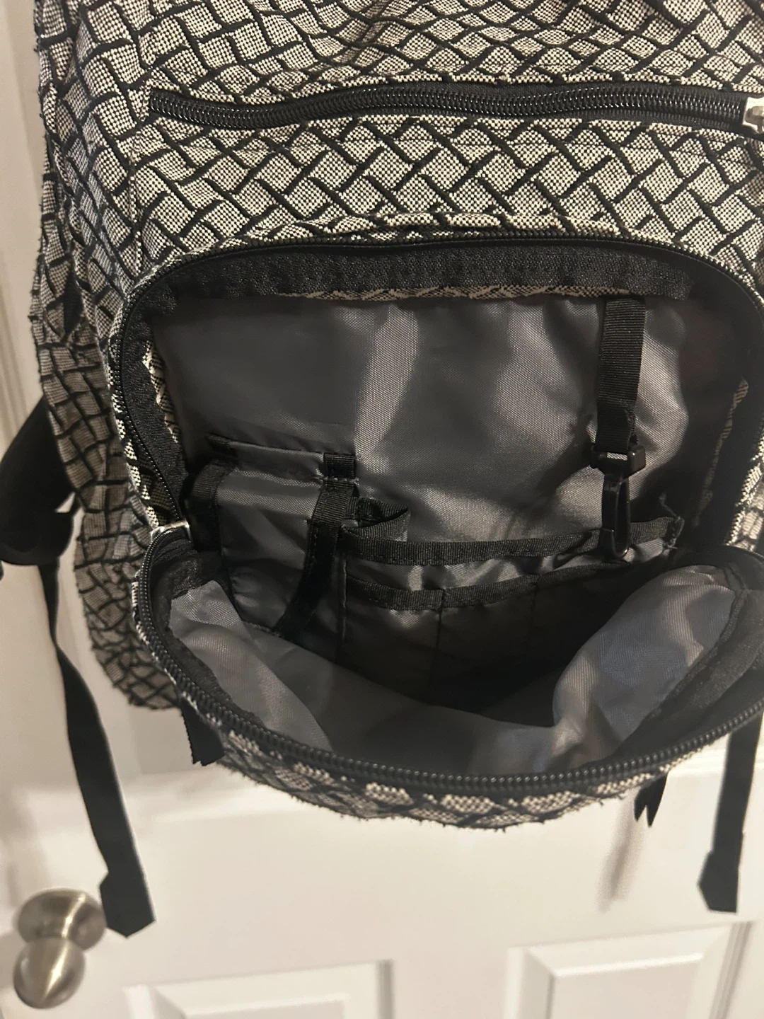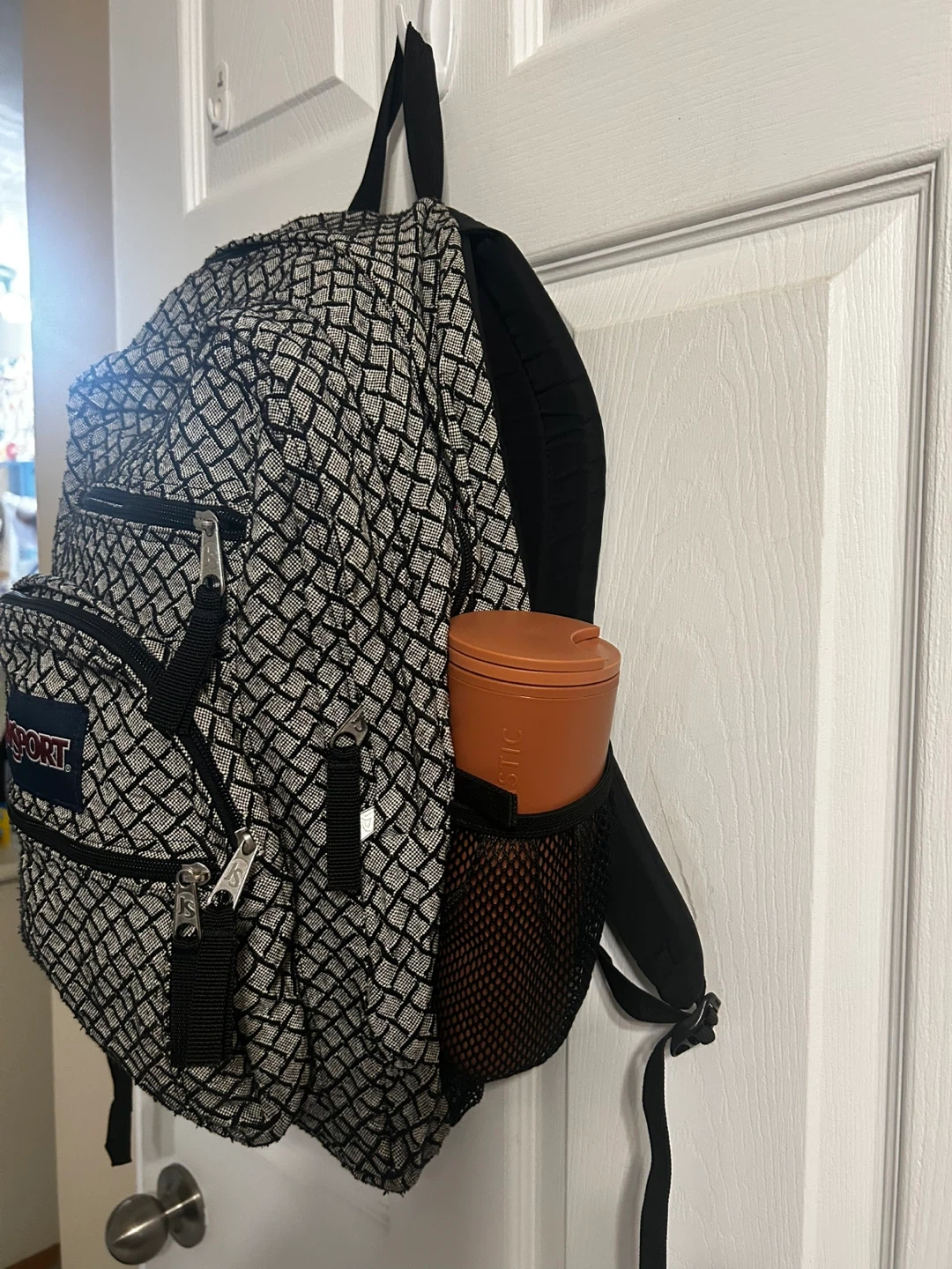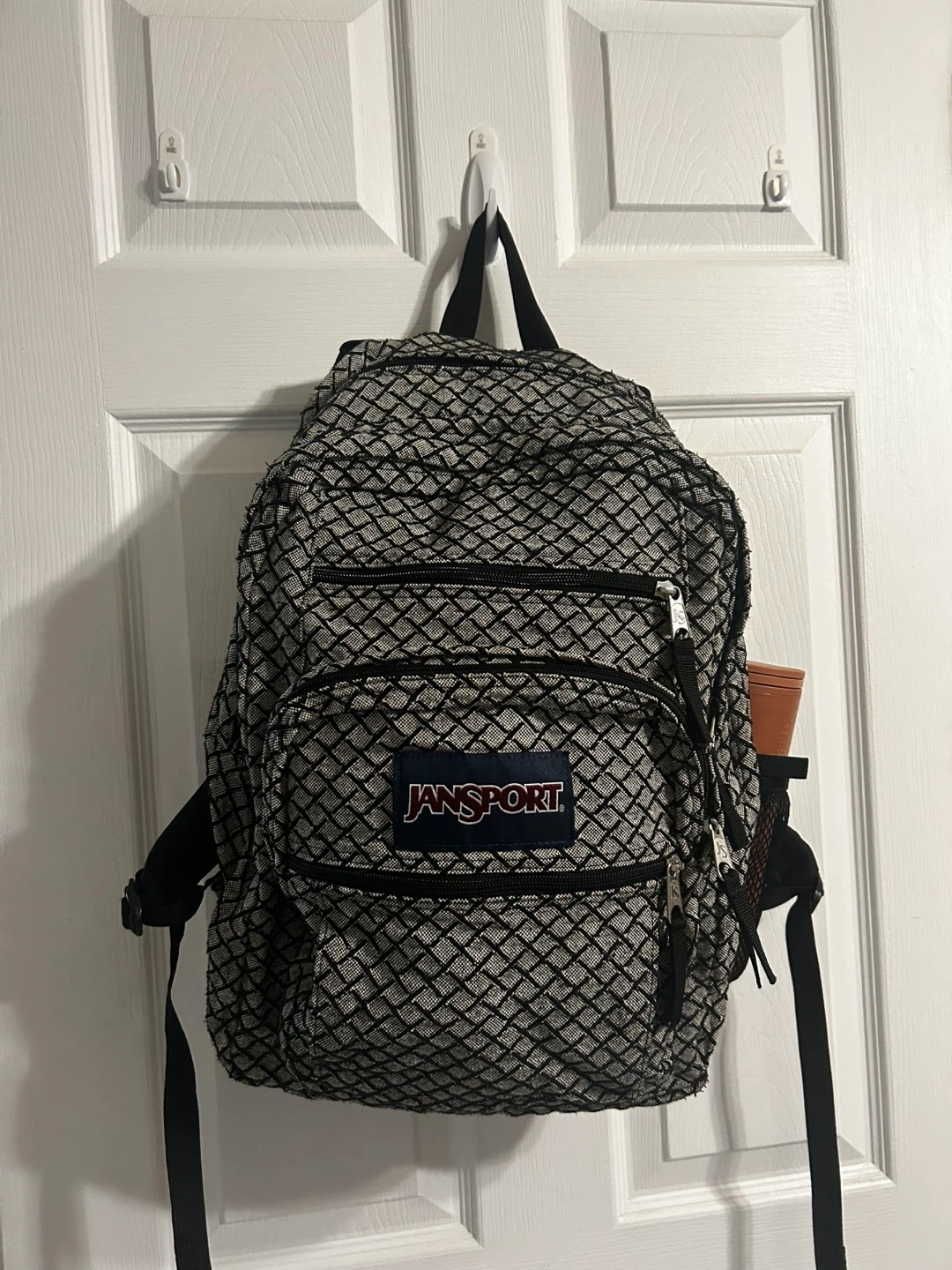 This JanSport backpack is black with a grey diamond pattern. It has multiple zippered compartments and a side mesh pocket. It's great for school or everyday use!