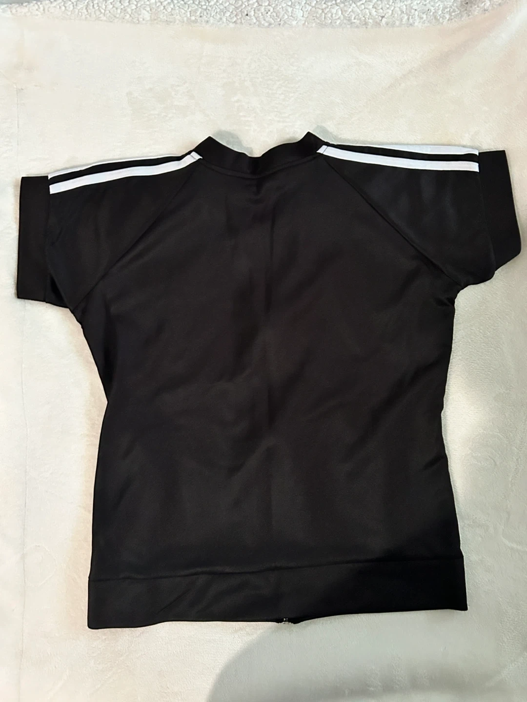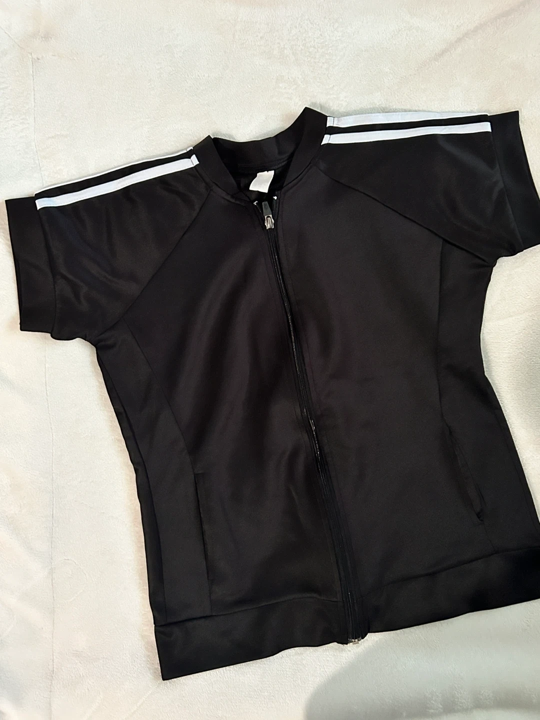 I'm selling a black track jacket. It features a zipper and white stripes on the shoulders. It's in great condition and ready for a new home! Fits size XS to S!