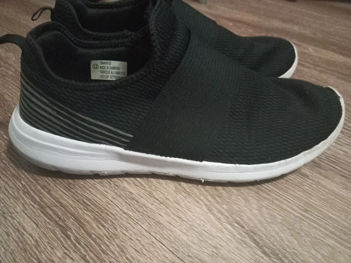 10Selling a pair of black slip on shoes in size 12. They're in used condition, as you can see from the photos, but still have plenty of life left in them. Great for casual wear or light exercise!