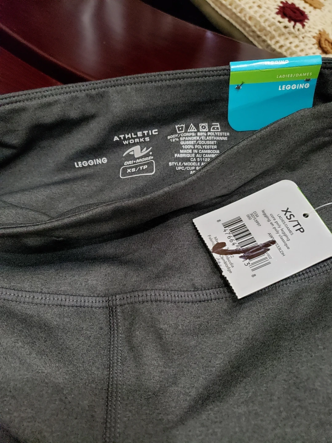 I'm selling a brand new pair of Athletic Works leggings! They're a size XS/TP and made with DRI-MORE technology. The body is composed of 88% polyester and 12% spandex, making them super comfy for workouts or just lounging around