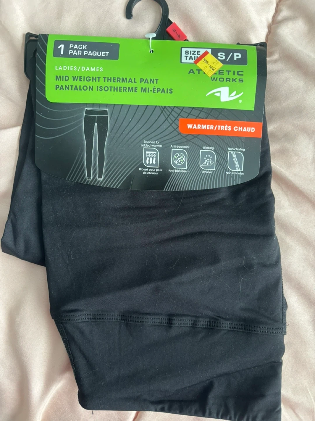 Brand new, never worn ladies thermal pants. Only 5.00 Athletic Works mid-weight thermal pants, size S/P. These pants are designed to keep you warmer with their brushed fabric for added warmth. They also feature anti-bacterial and wicking properties, and are non-chafing