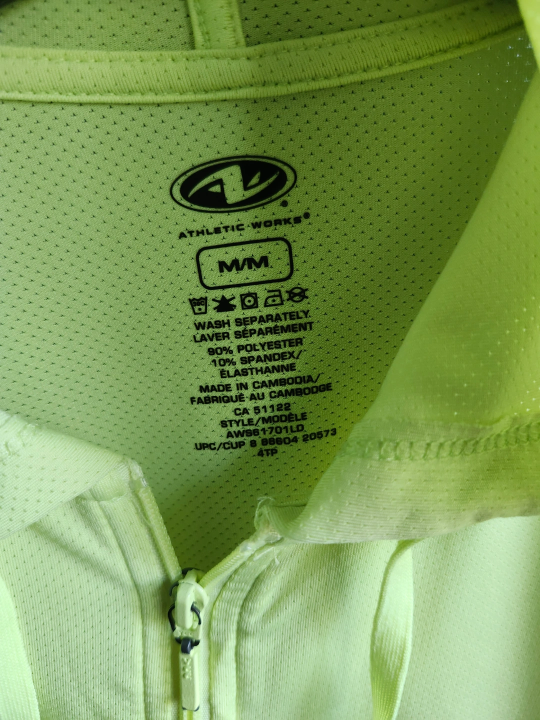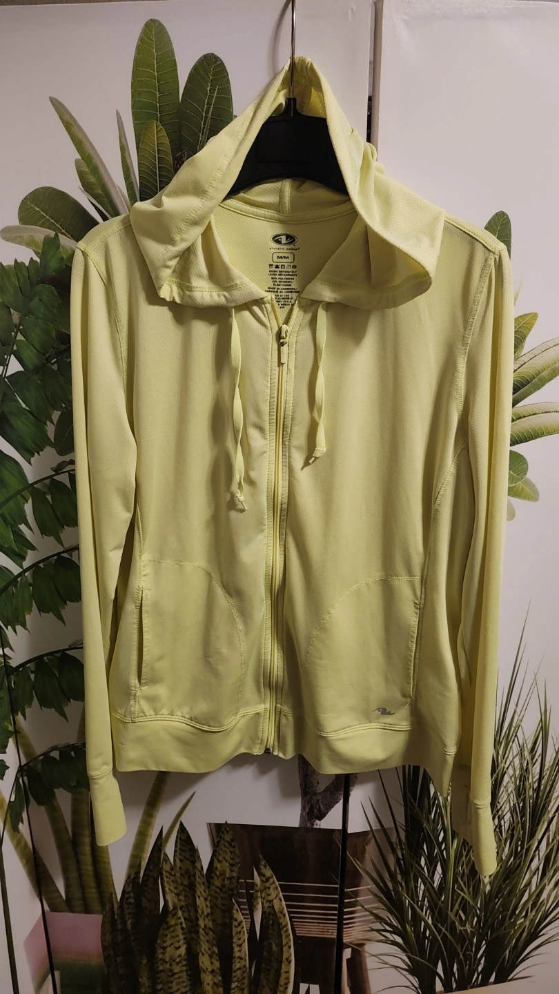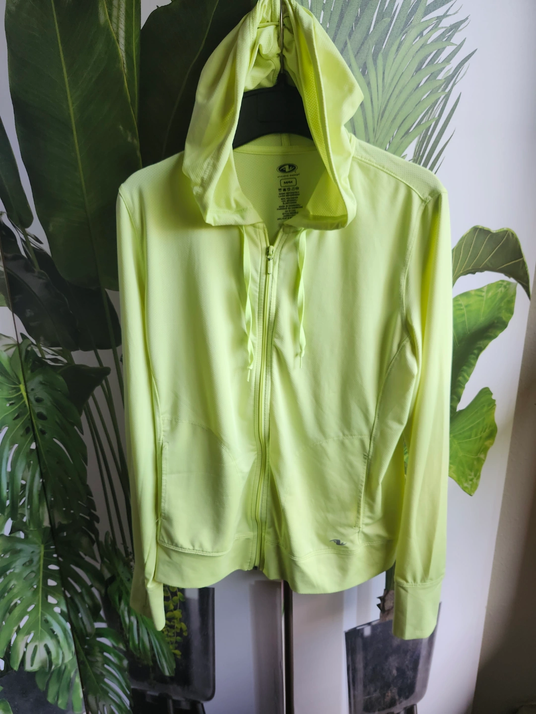 37Women's athletic zip-up hoodie. Lime green colour. Size medium. 90% polyester, 10% spandex. Made in Cambodia. Features a hood and front zipper.