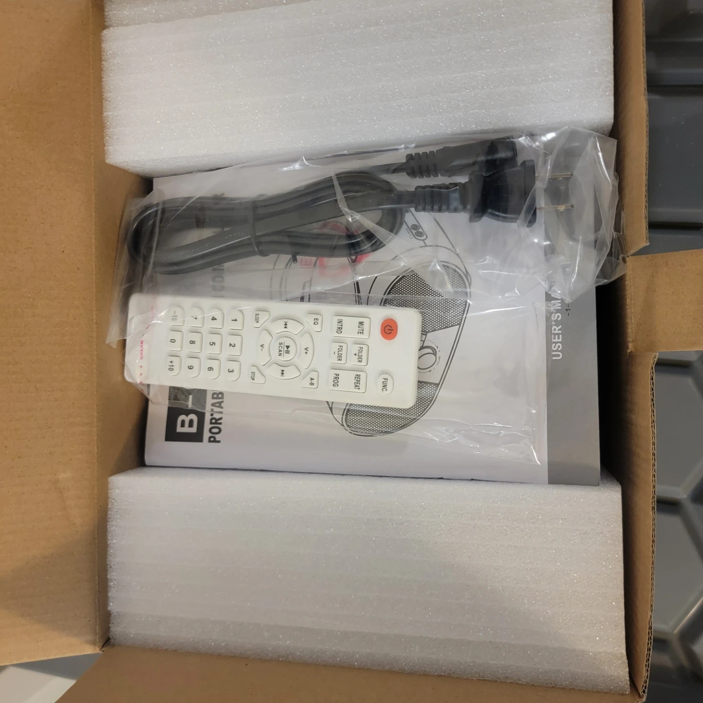 This portable CD radio player comes with a remote and AC adapter. It's in its original box. Great for listening to music anywhere!