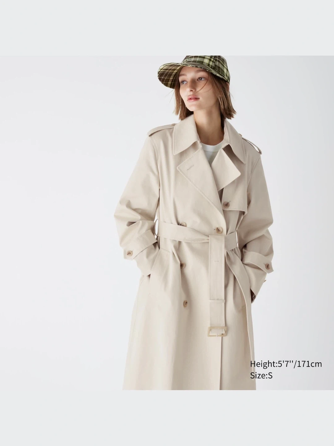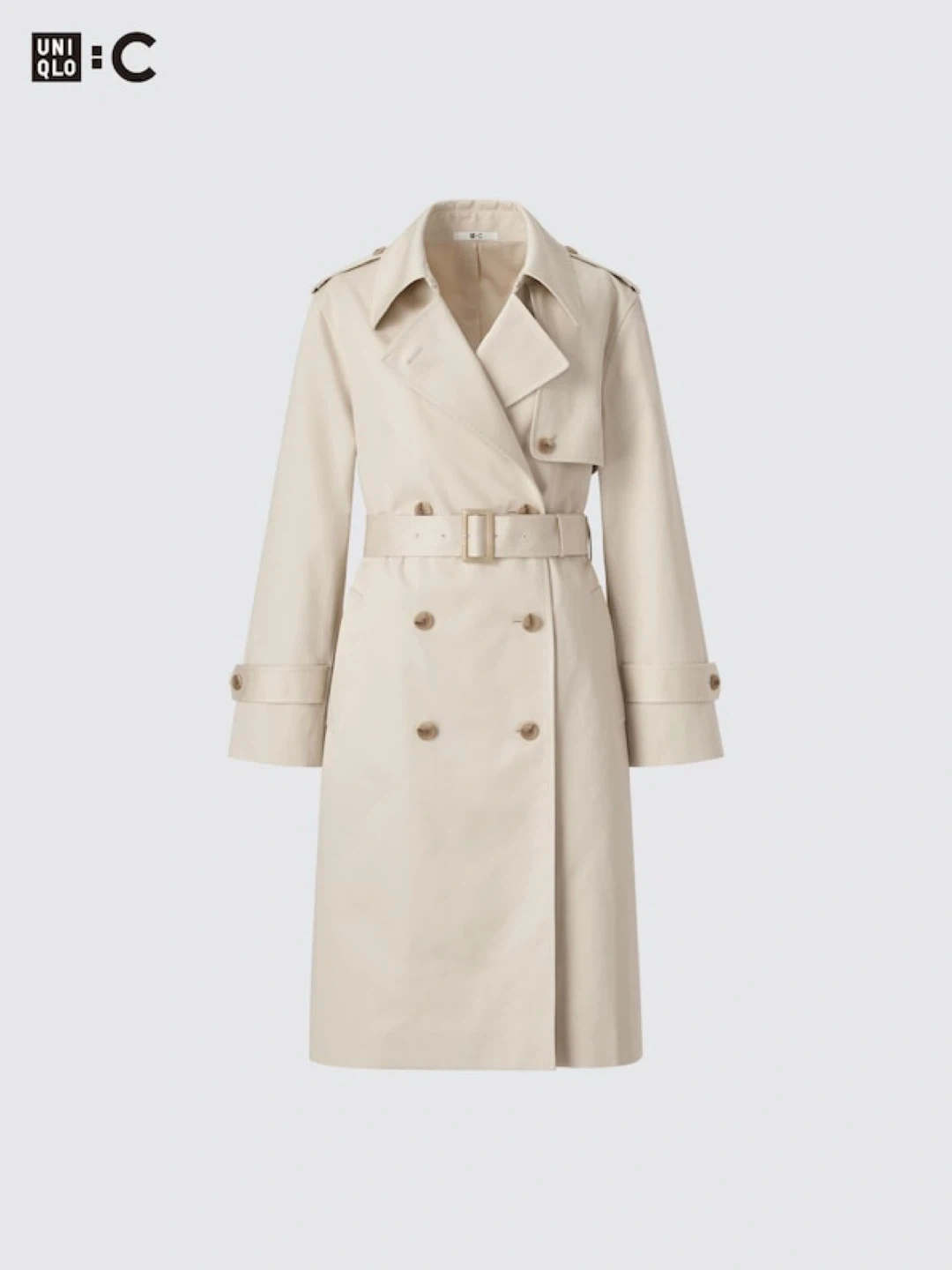 Classic beige trench coat from UNIQLO C. Double-breasted design with a belted waist.