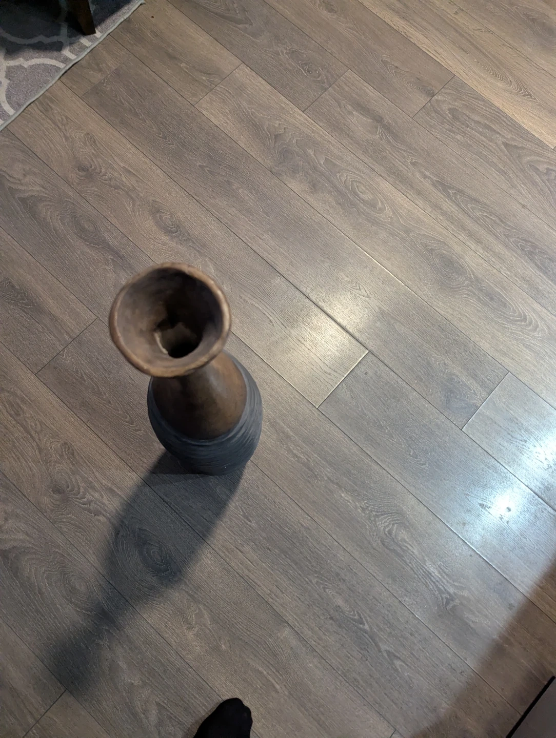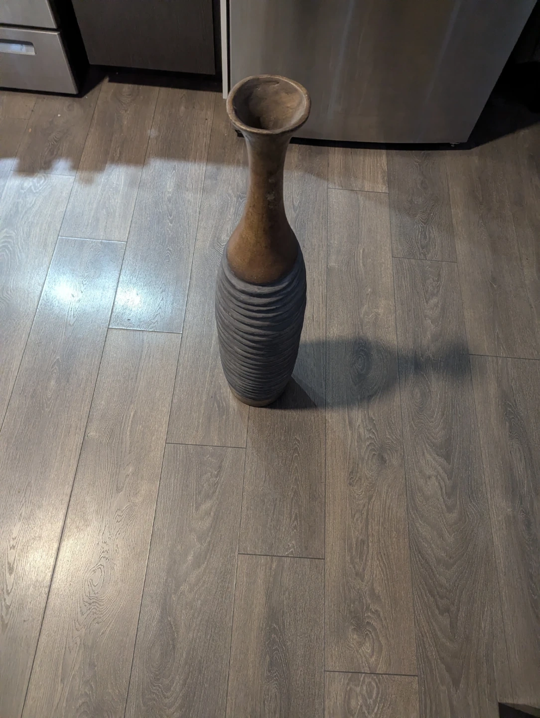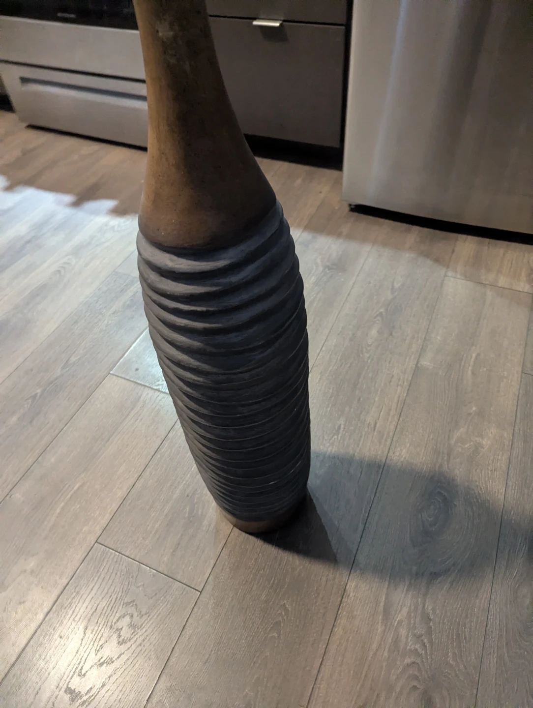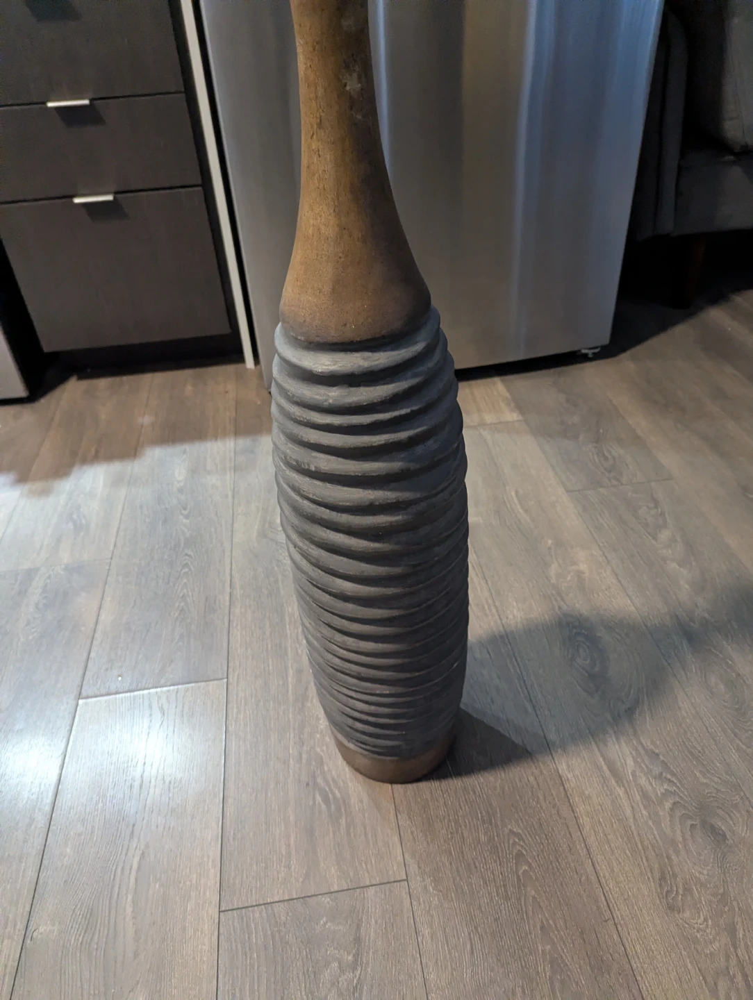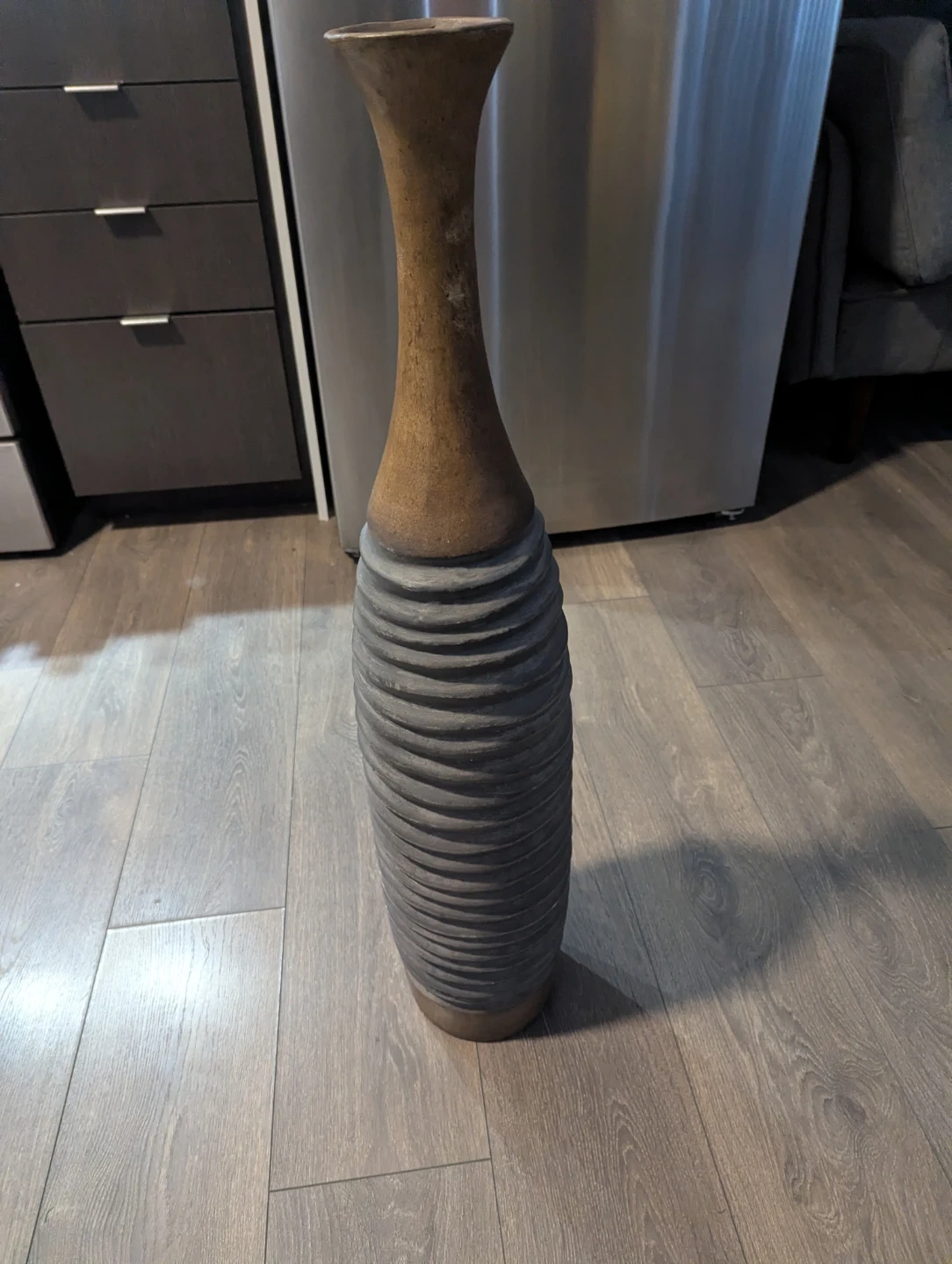 This is a tall ceramic vase with a textured grey base and a smooth brown neck. It's perfect for adding a decorative touch to any room. The vase stands tall and would suit dried flowers or greenery.