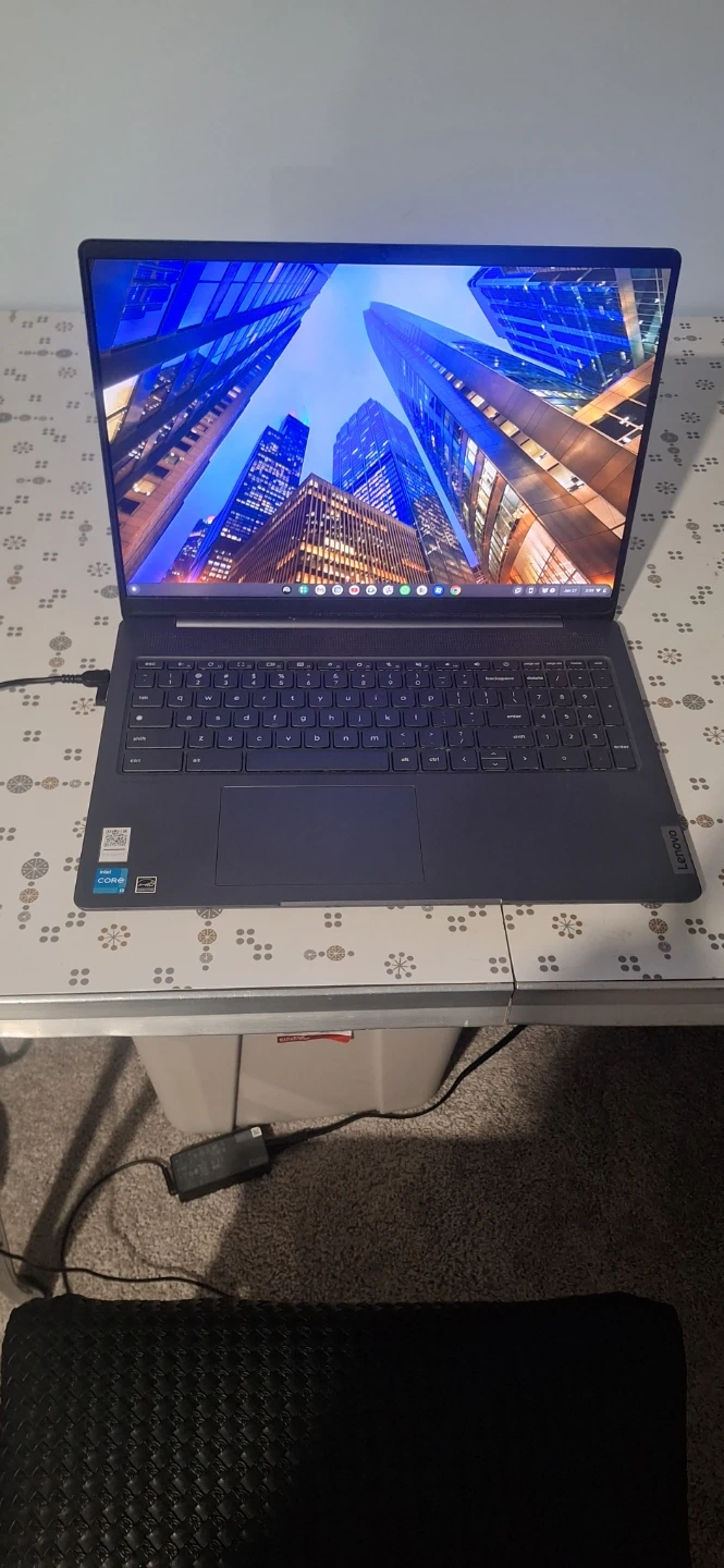 This is a Lenovo Chromebook laptop. It runs Google ChromeOS version 143. It's a 64-bit system. The device is grey and comes with a power adapter.