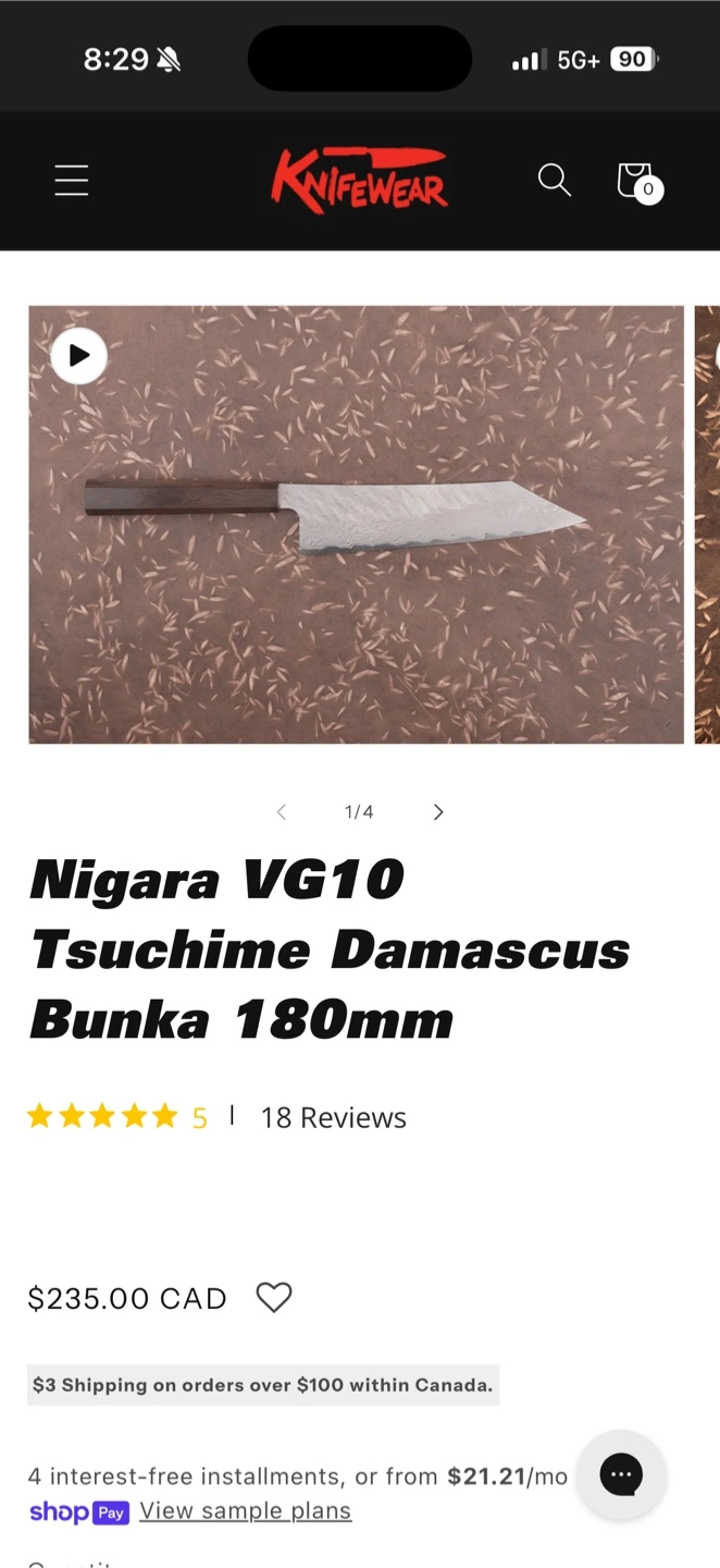 This is a Nigara VG10 Damascus Bunka knife with a 180mm blade. It features a Tsuchime hammered finish and a VG10 steel core. The handle is made of dark wood.