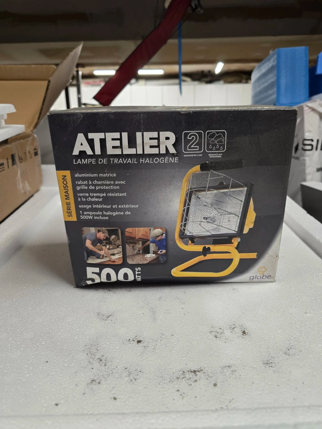 ATELIER halogen work lamp with a metal casing and a hinged flap with a protective grille. Features tempered glass and is suitable for indoor and outdoor use. Includes one 500W halogen bulb. This lamp's durable construction makes it a solid choice for various lighting needs.