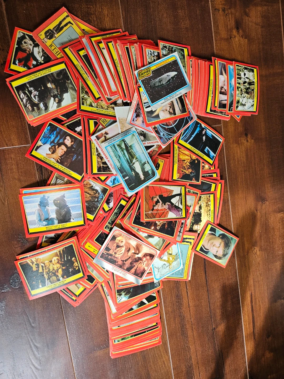 Bundle of Star Wars trading cards, featuring characters and scenes from The Empire Strikes Back. Includes various characters like Han Solo, Stormtroopers, and Jawas. These cards are from the original trading card sets. Great for any Star Wars collector!