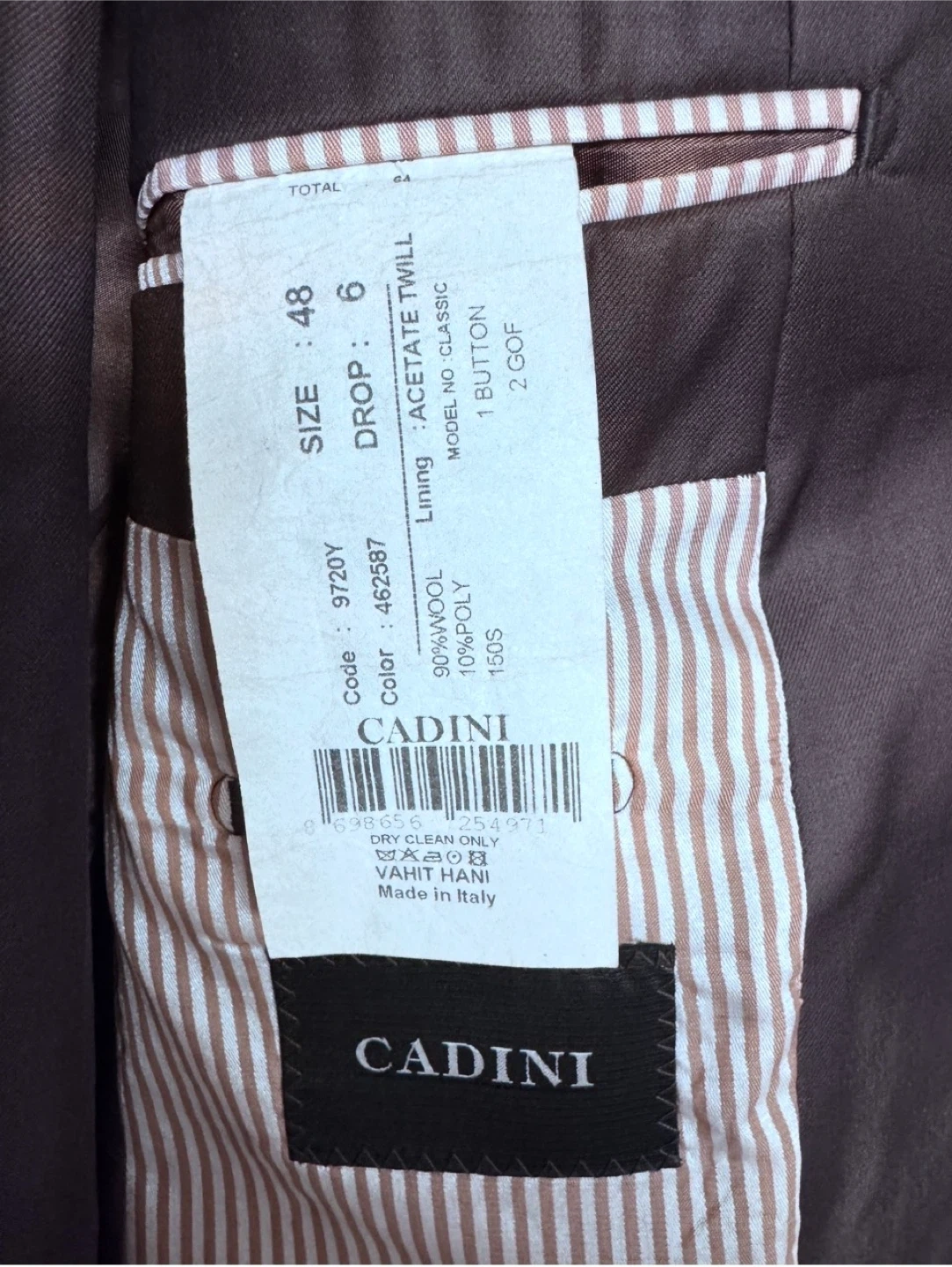 Selling a Cadini suit in size 48. The colour is a nice brown. The lining is acetate twill. It's made of 90% wool and 10% poly. It's a classic model with a one-button closure