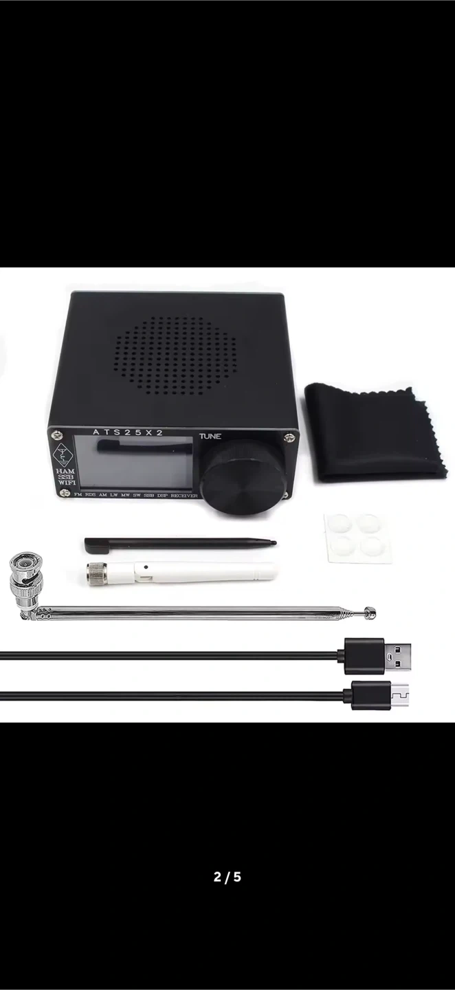 10Selling an ATS25X2 radio receiver. It supports FM, AM, LW, SW, and SSB bands. Also included are various accessories such as a cleaning cloth, antenna, and USB cables.