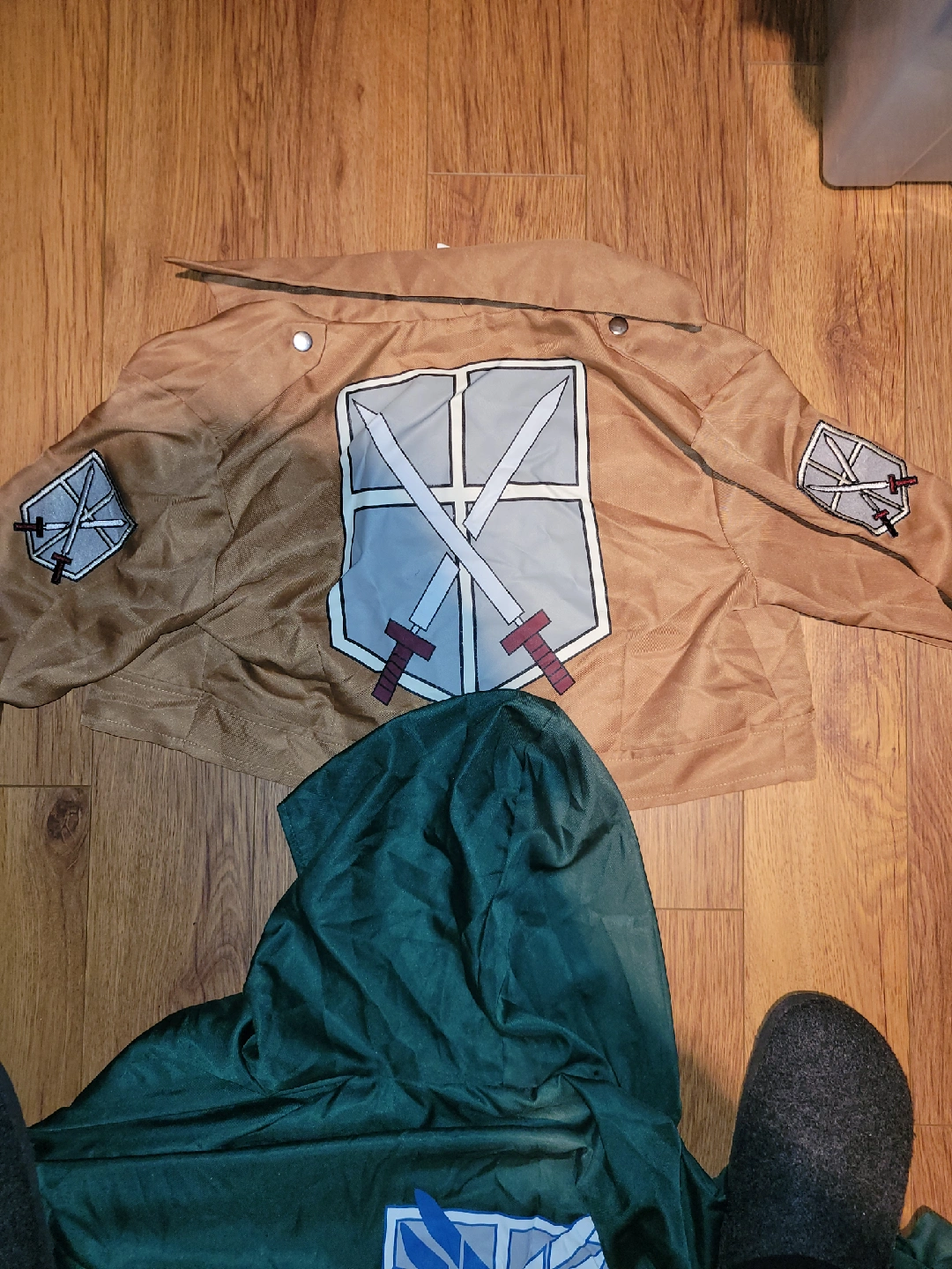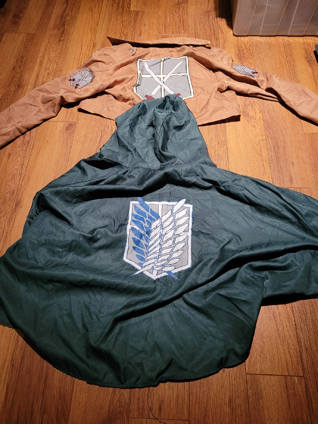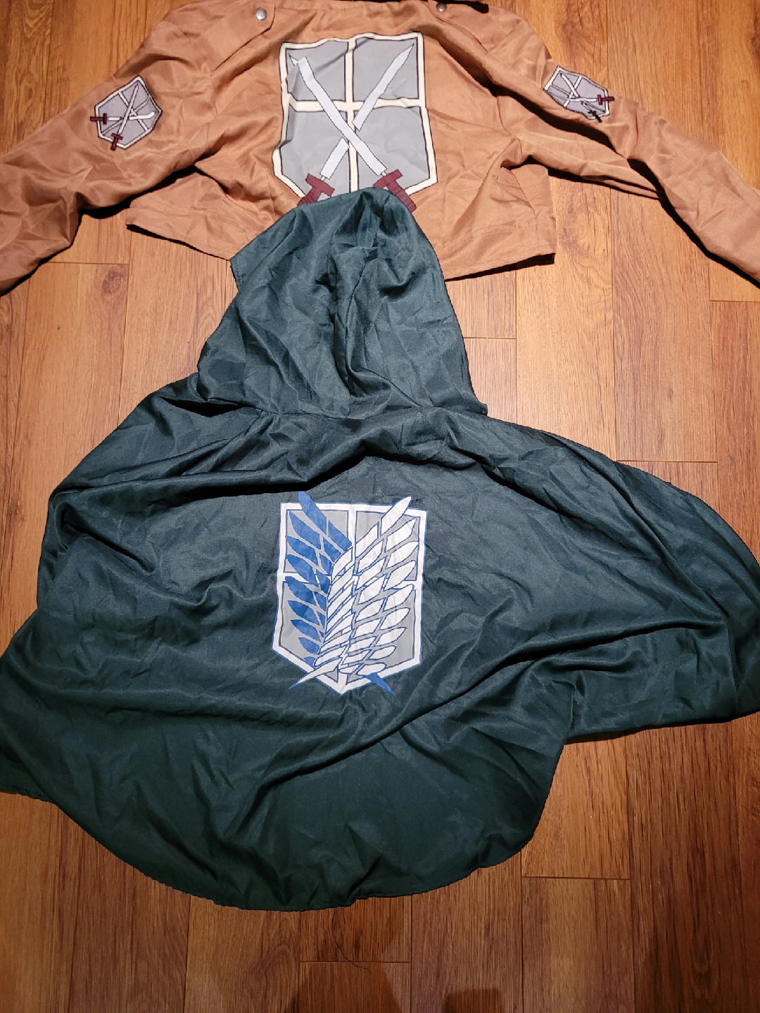 12Selling two Attack on Titan cosplay jackets. One is the Survey Corps jacket and the other is a hooded cape version. Both have the Wings of Freedom logo on the back. Great for any AoT fan!