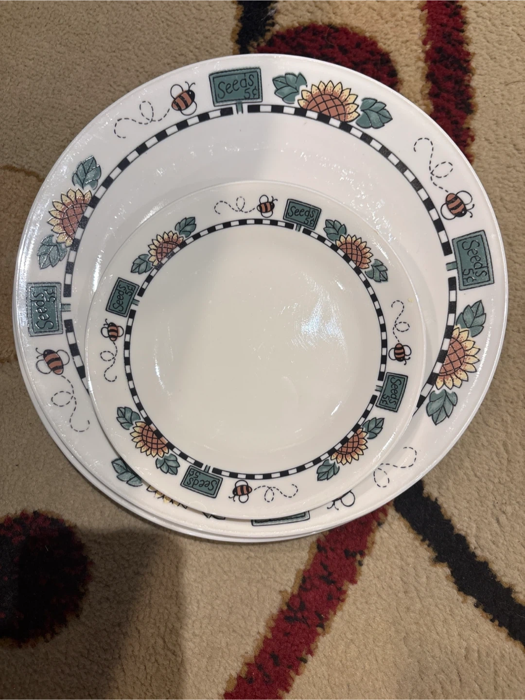 Set of Corelle plates featuring a charming bumblebee and sunflower design. These plates are microwave safe and made from durable material. They're perfect for everyday use or special occasions!