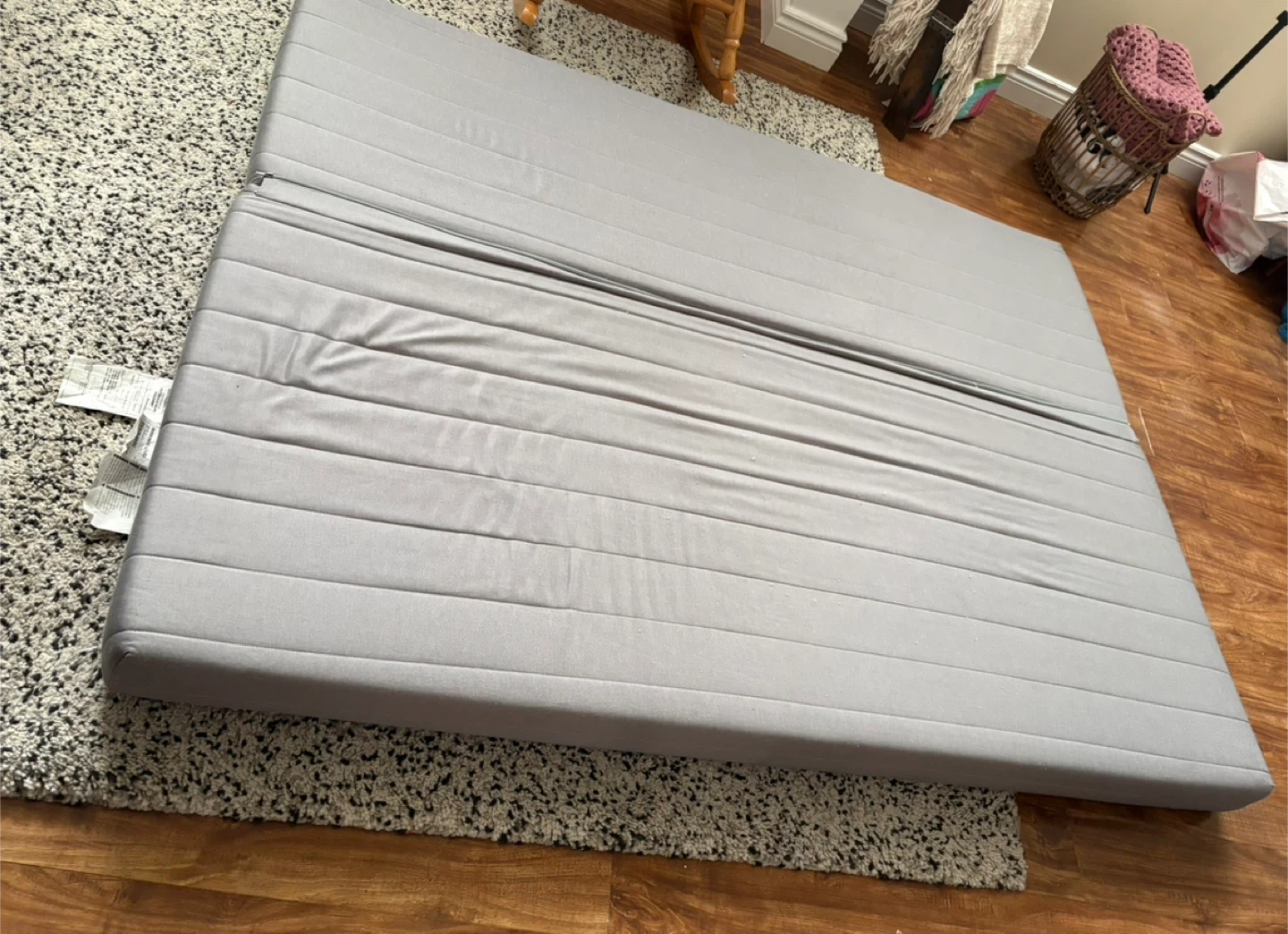Grey foldable foam mattress. It's made of foam and has a soft fabric cover. Perfect for unexpected guests or small spaces!