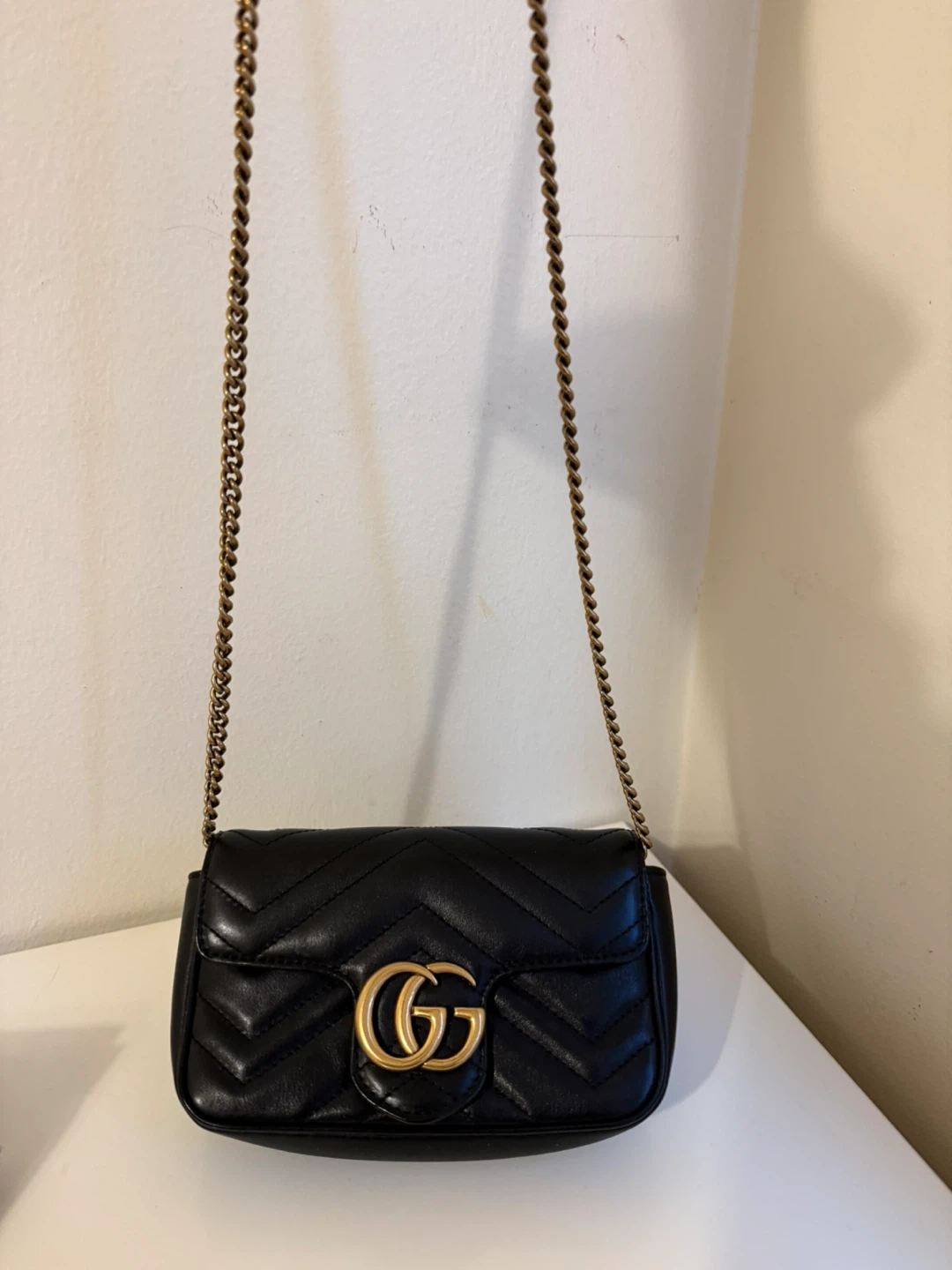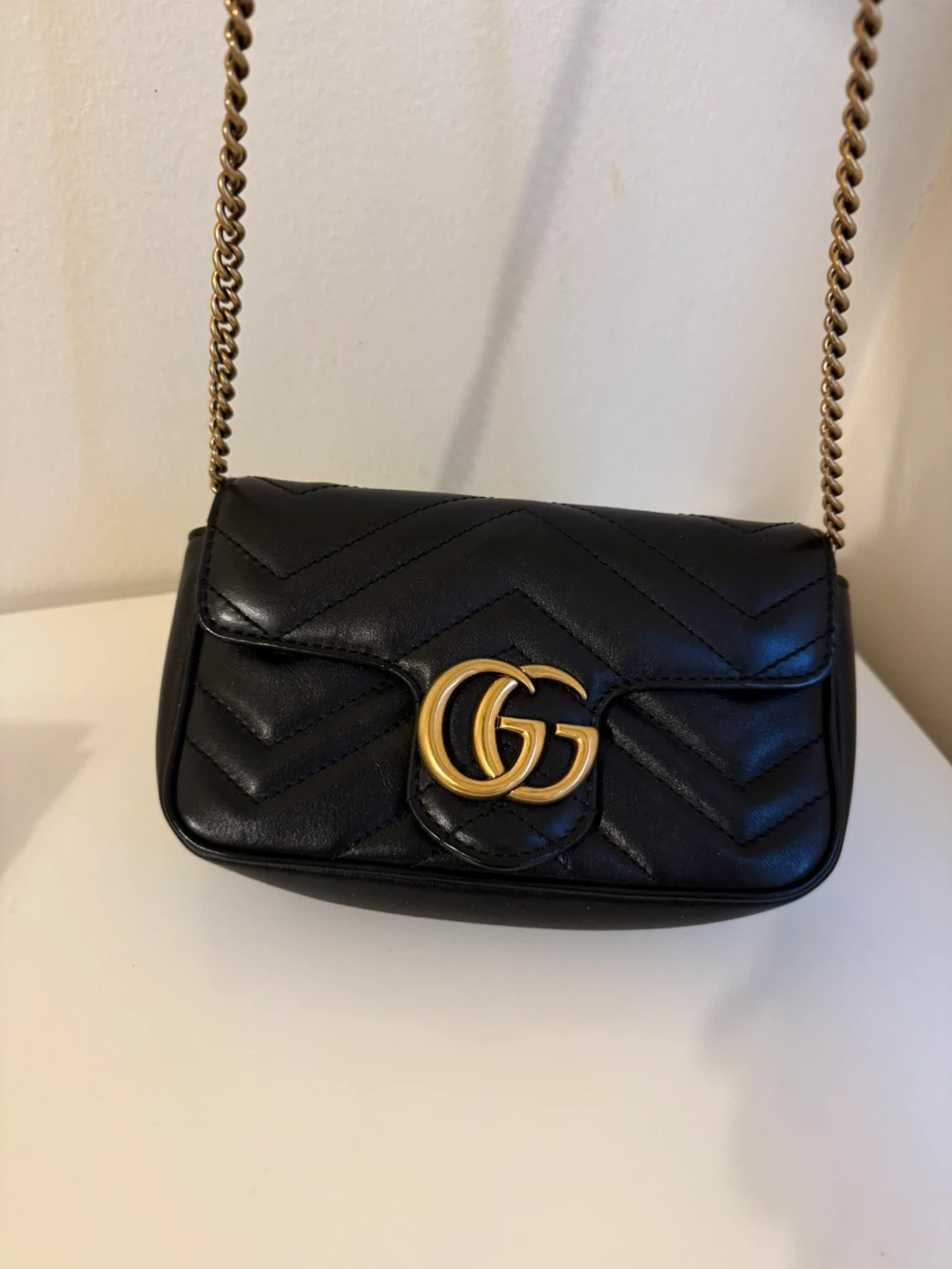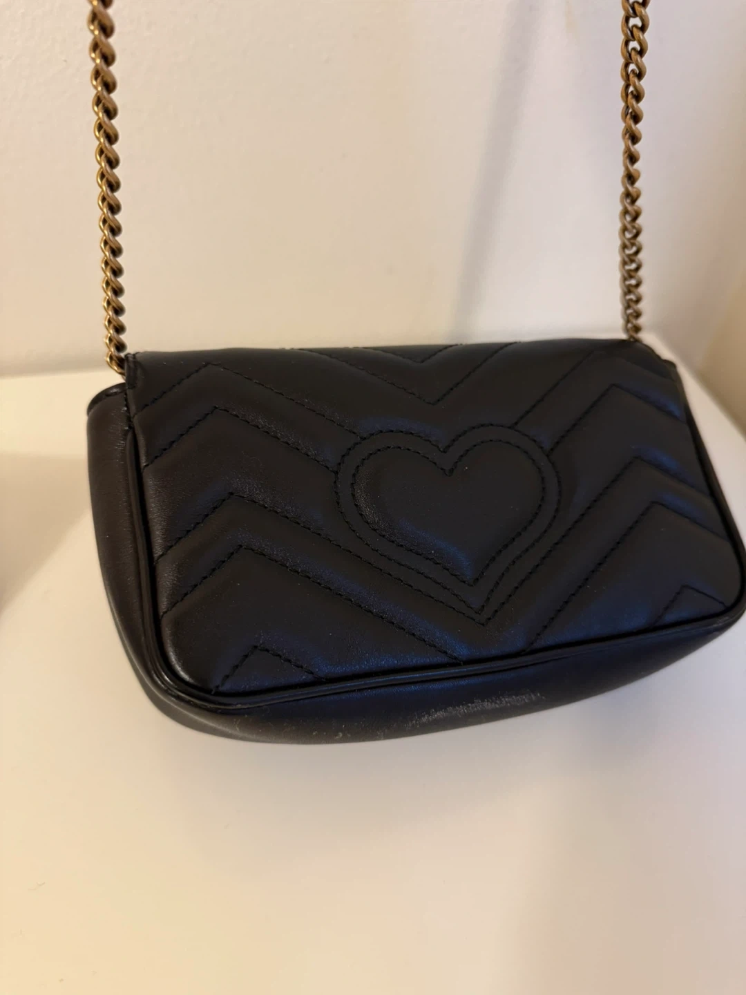 This is a Gucci Marmont mini bag in black quilted leather. It features the iconic GG hardware and a gold-tone chain strap. A heart detail is embossed on the back.