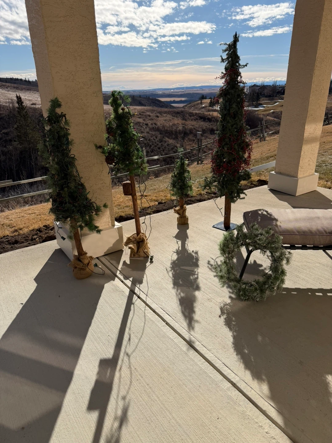 Decorated artificial Christmas trees for outdoor or indoor use. Includes lights and berry accents. Comes in various sizes.