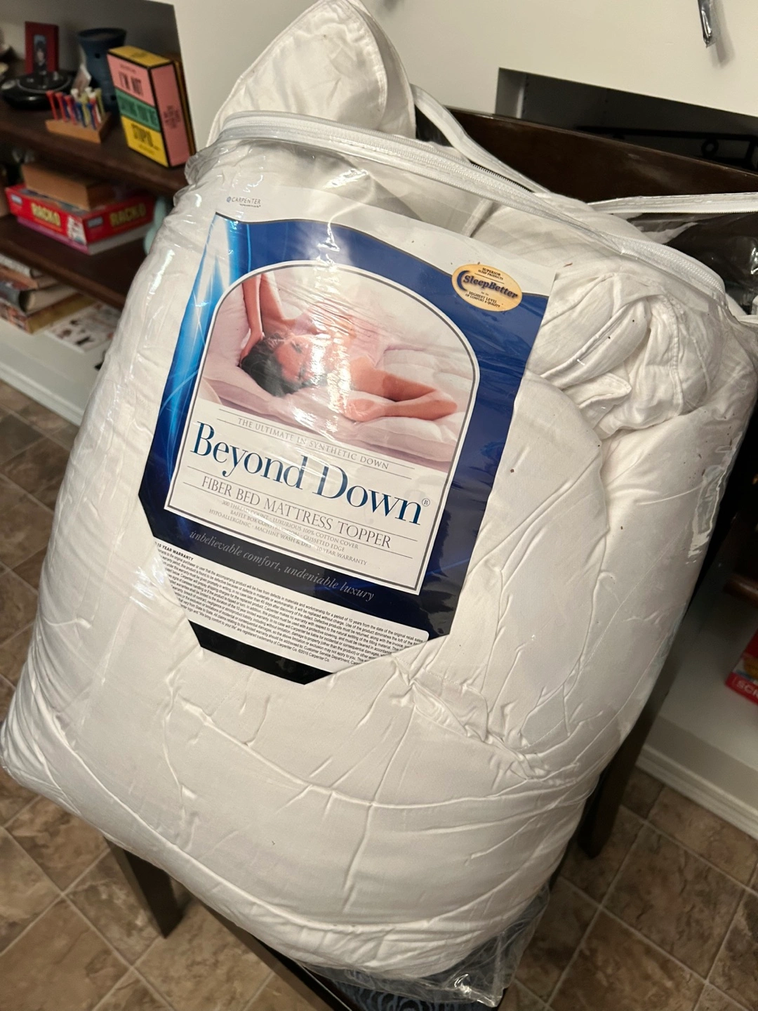 New, unopened Beyond Down fiber bed mattress topper. Ultimate synthetic down. Hypoallergenic. Includes 10-year warranty. 200 thread count, baffle box construction, quilted edges. King size