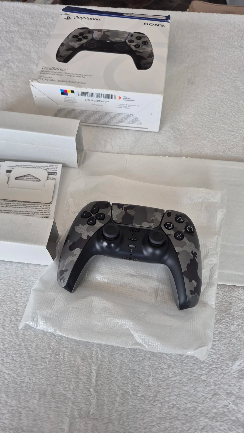 This is a PlayStation 5 DualSense wireless controller in a Gray Camouflage design. It's compatible with PS5, PC, Mac, and mobile devices via Bluetooth. Includes the original box.