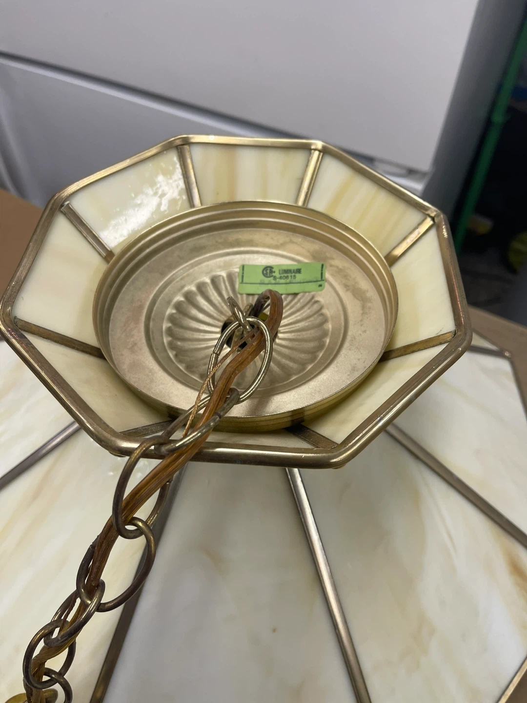 This is a Tiffany style stained glass pendant light fixture with a brass-coloured metal frame. From the 1970s style It features a cream and amber marbled glass shade. Includes a metal hanging chain and electrical cord. 15”D x 12” H. Cash only