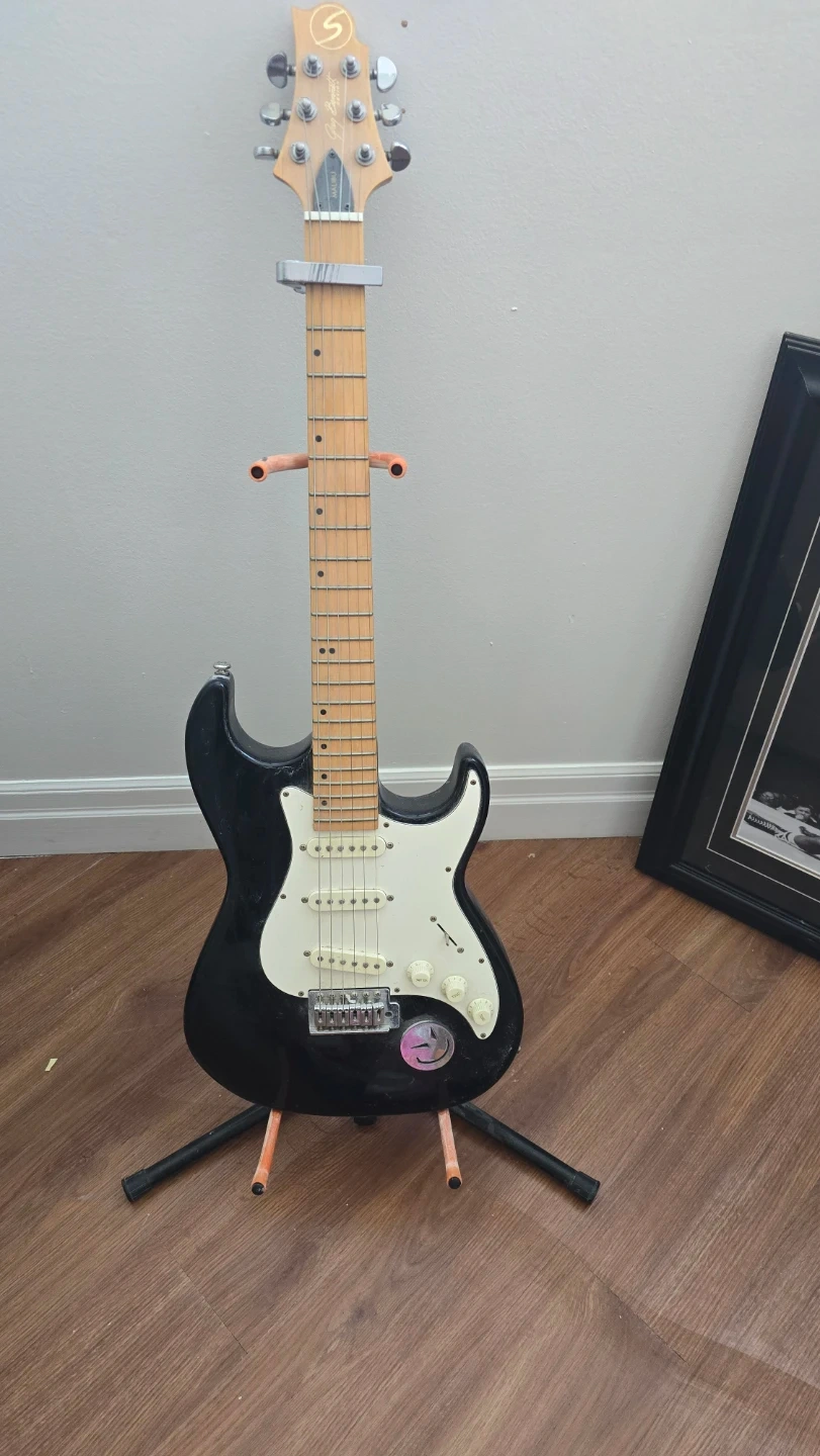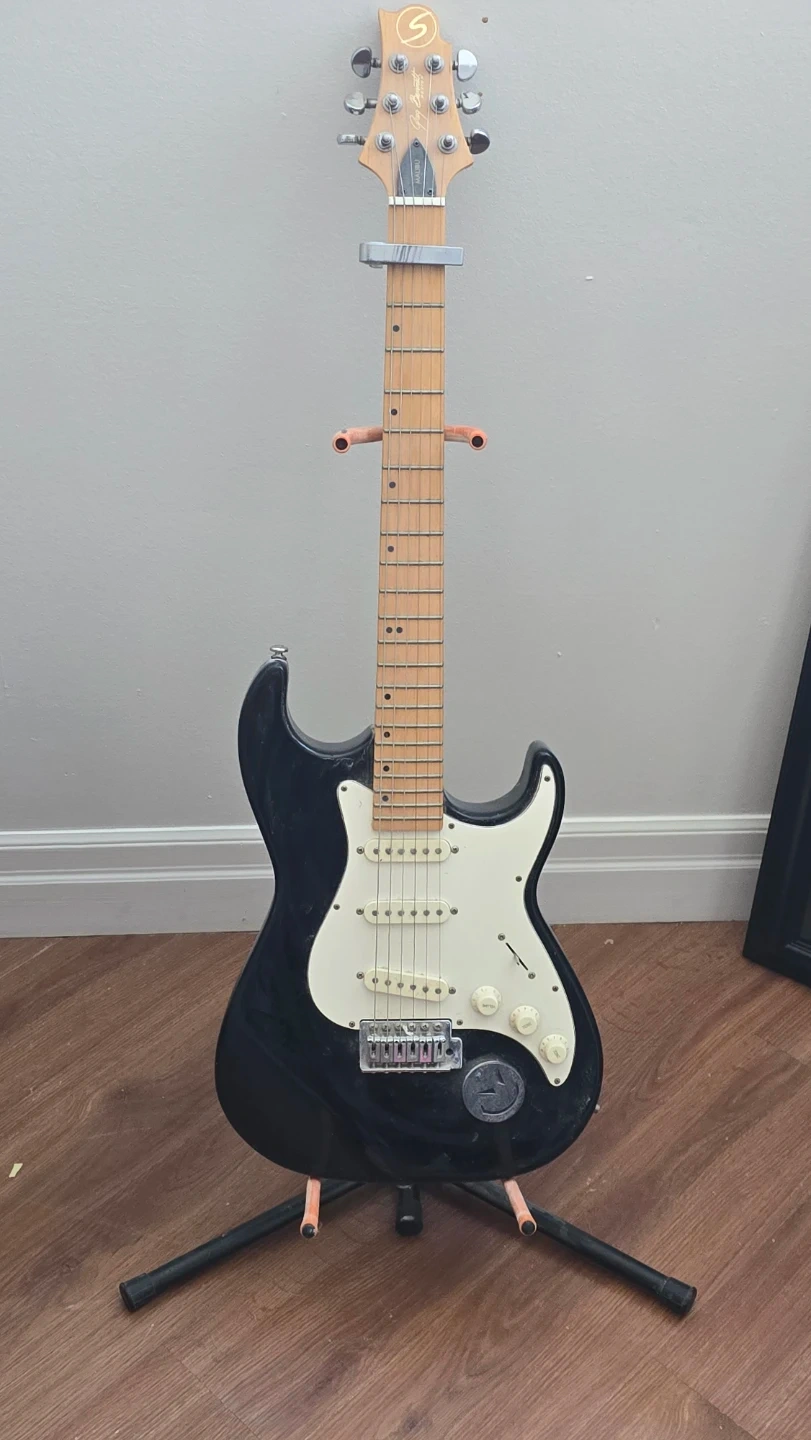 Black Squier Stratocaster electric guitar. Features a maple fretboard and white pickguard. Includes a capo. Ready for practice or performance!