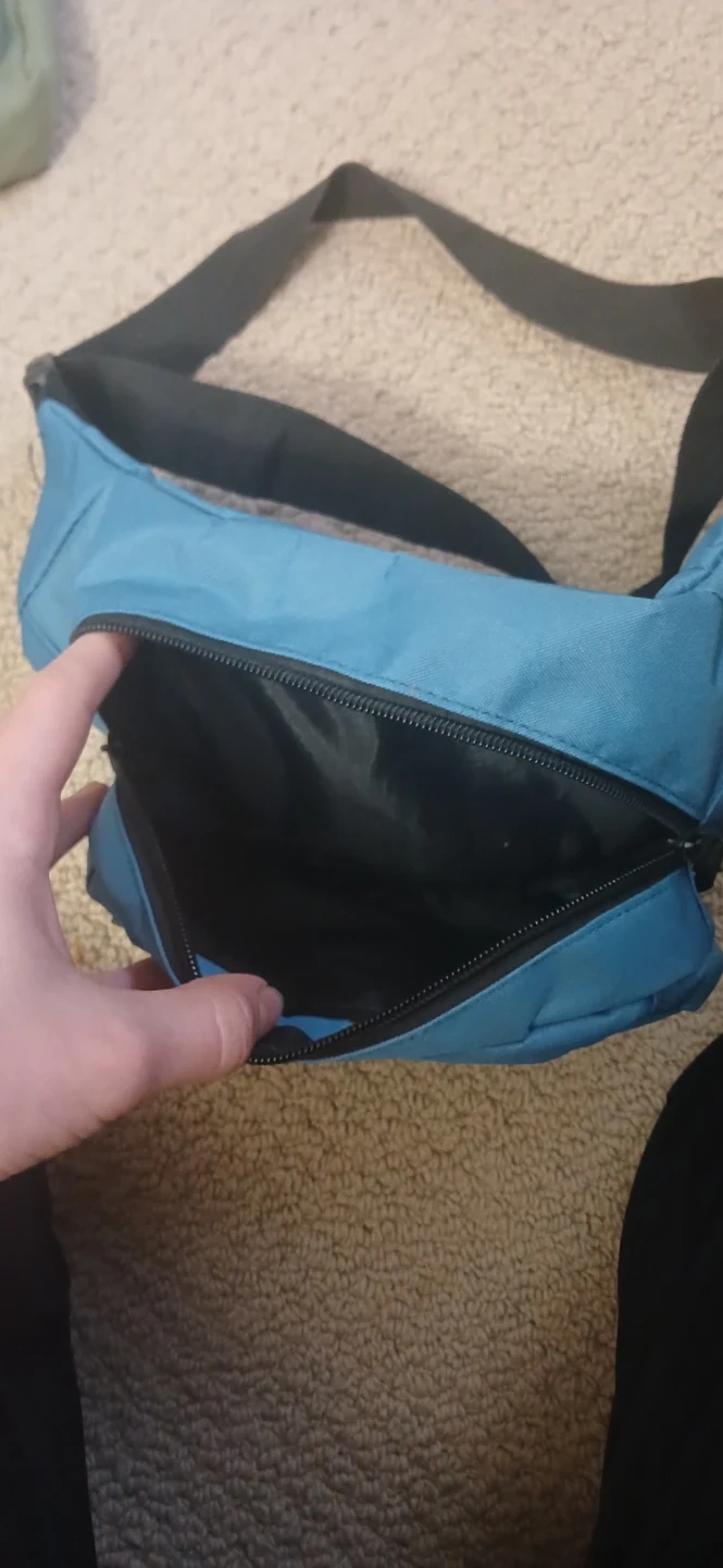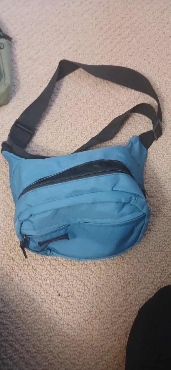 This is a small red and ue and green pouches . It has a zippered main compartment and a front pocket. Made with durable fabric.