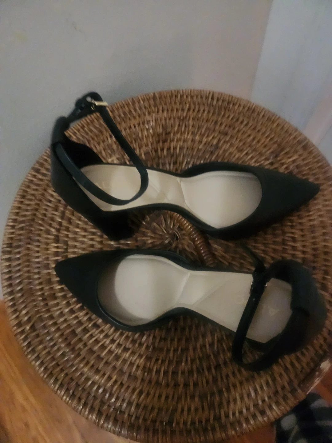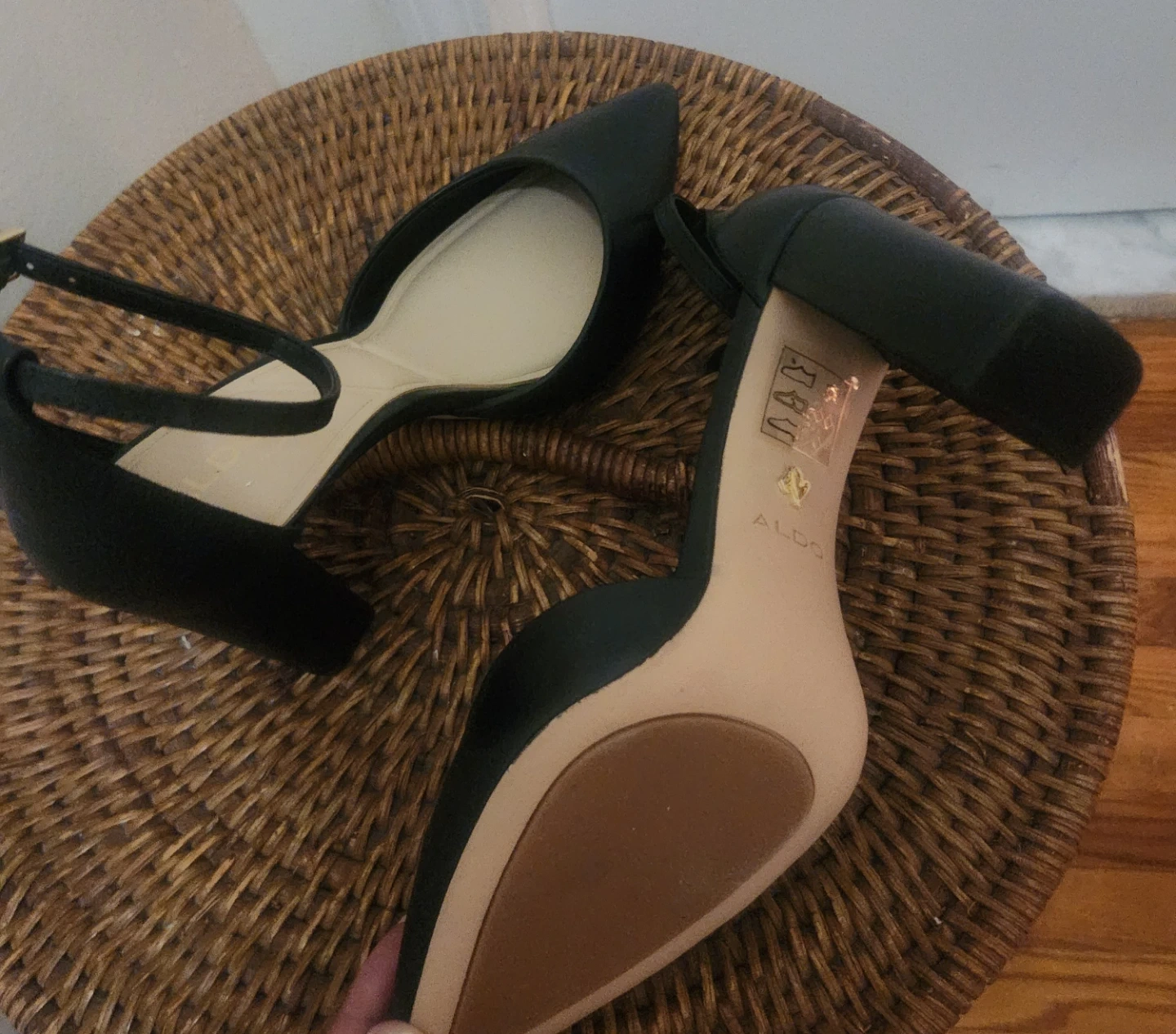 These ALDO heels are black with an ankle strap and block heel. They feature a pointed toe and cushioned insole. Leather upper. Heel height 3 inches.