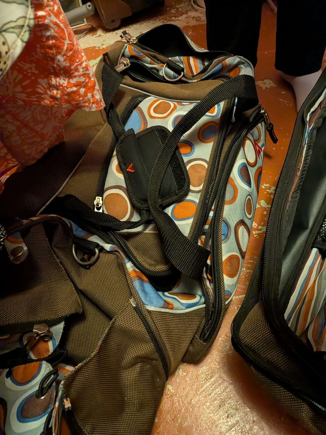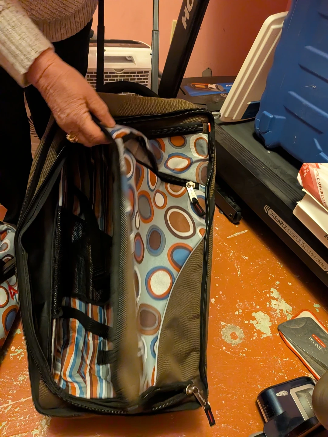 This is a brown rolling suitcase with a vibrant striped and circular pattern lining. It features multiple zippered compartments and a retractable handle. Its durable fabric construction makes it great for travel!