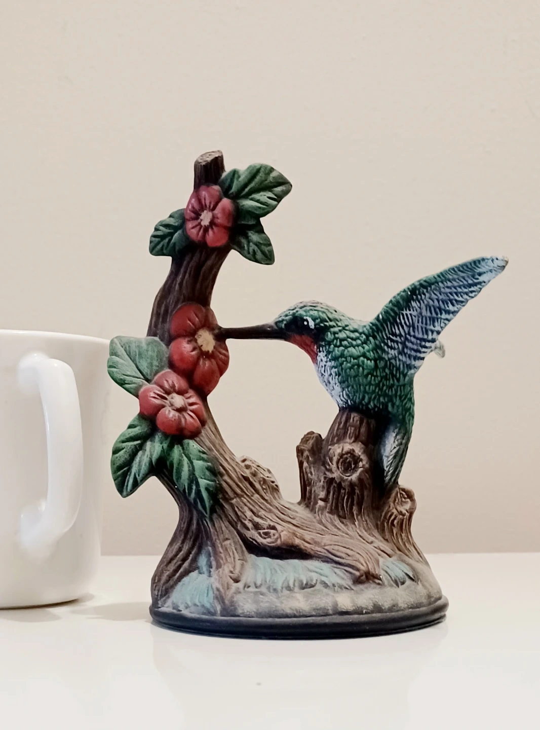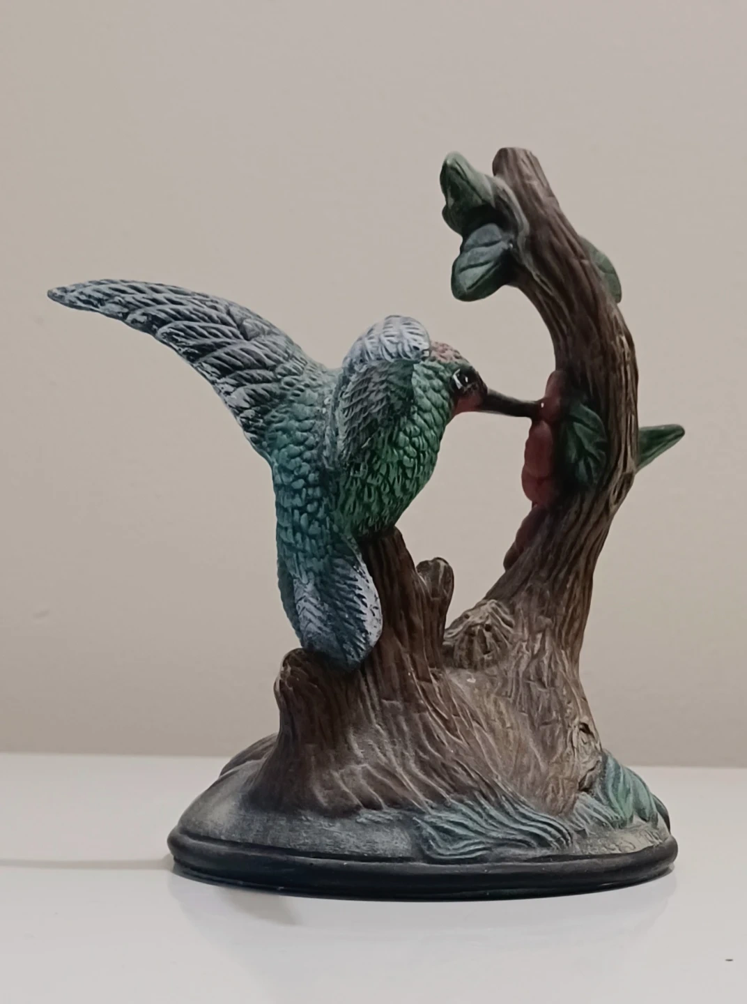 Add a touch of nature to your home with this unique, charming vintage , Hand Painted Hummingbird Figurine, featuring a detailed design of a hummingbird feeding from a flowering branch. The figurine is in excellent condition, displaying vibrant colours and intricate details.