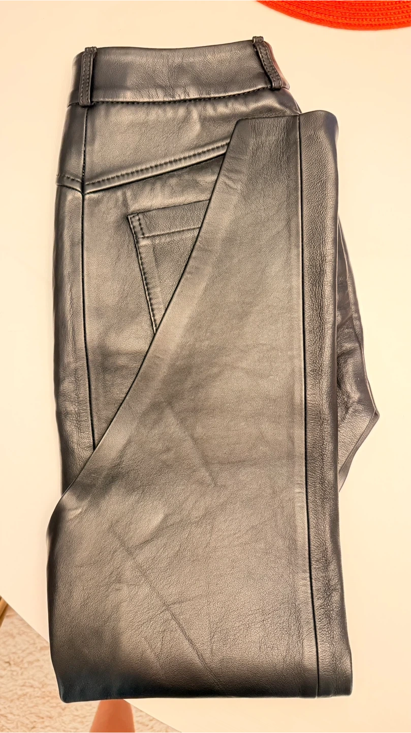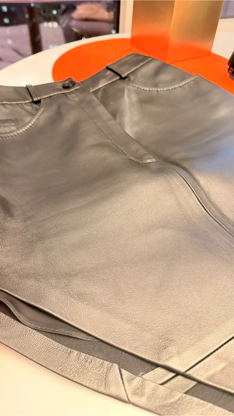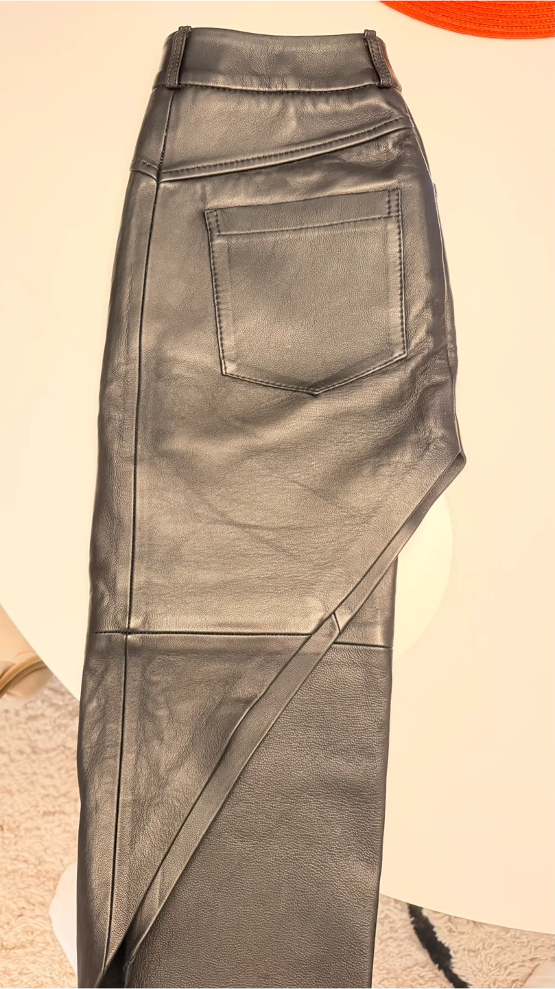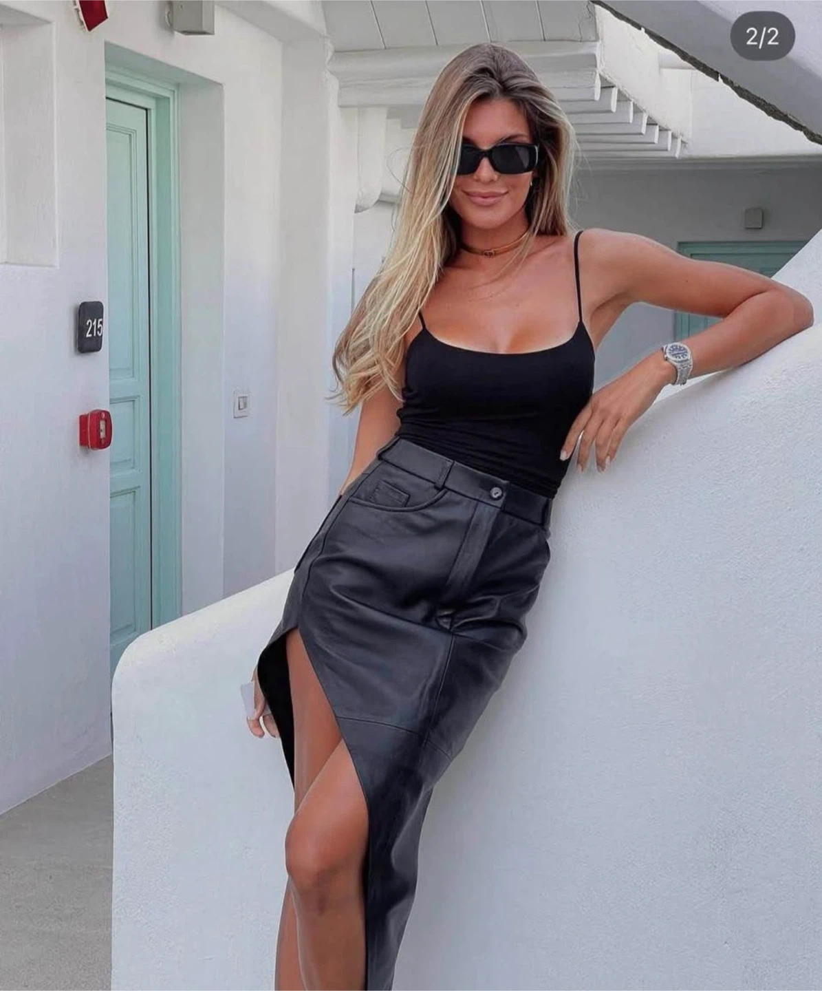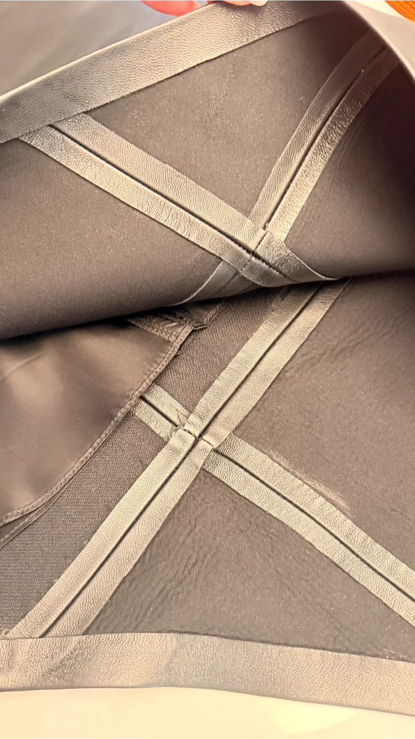 This black skirt features an asymmetrical hem and faux leather material. It's designed with a unique criss-cross stitch detail on the front panels. Faux leather construction.