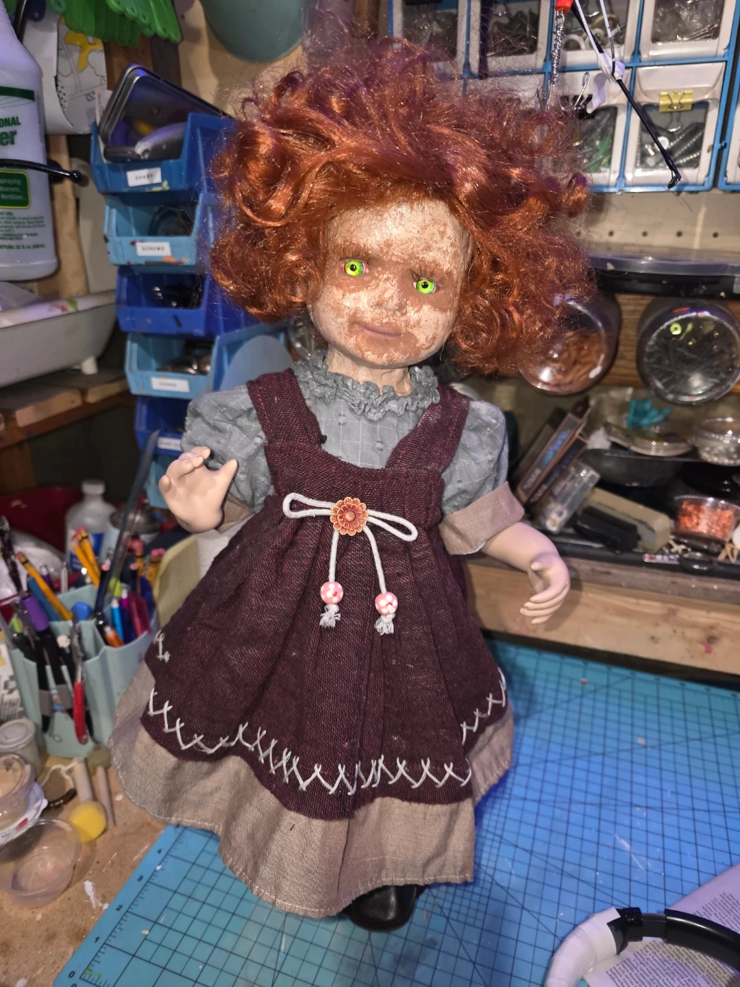 This is a unique handmade doll with bright green eyes and wild red hair. It's wearing a grey checkered shirt with a burgundy jumper dress adorned with a floral accent. The dress has decorative stitching at the hem and little pink bead tassels. The doll's face has a distressed look. 16" tall