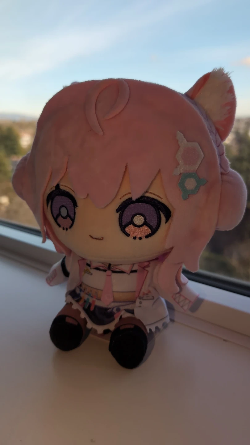 This is a soft, pink plush featuring Hakui Koyori from Hololive! This cure coyote vtuber has large purple eyes and a lab coat outfit. Perfect for anyone interested in Hololive!