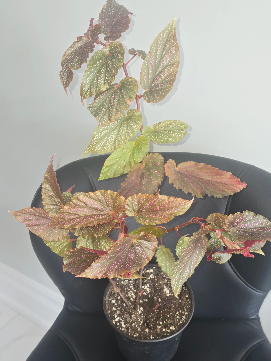 A healthy begonia plant with distinctive green leaves speckled with bright pink spots. Features ruffled edges and vibrant red stems. It's a lovely addition to any indoor space!