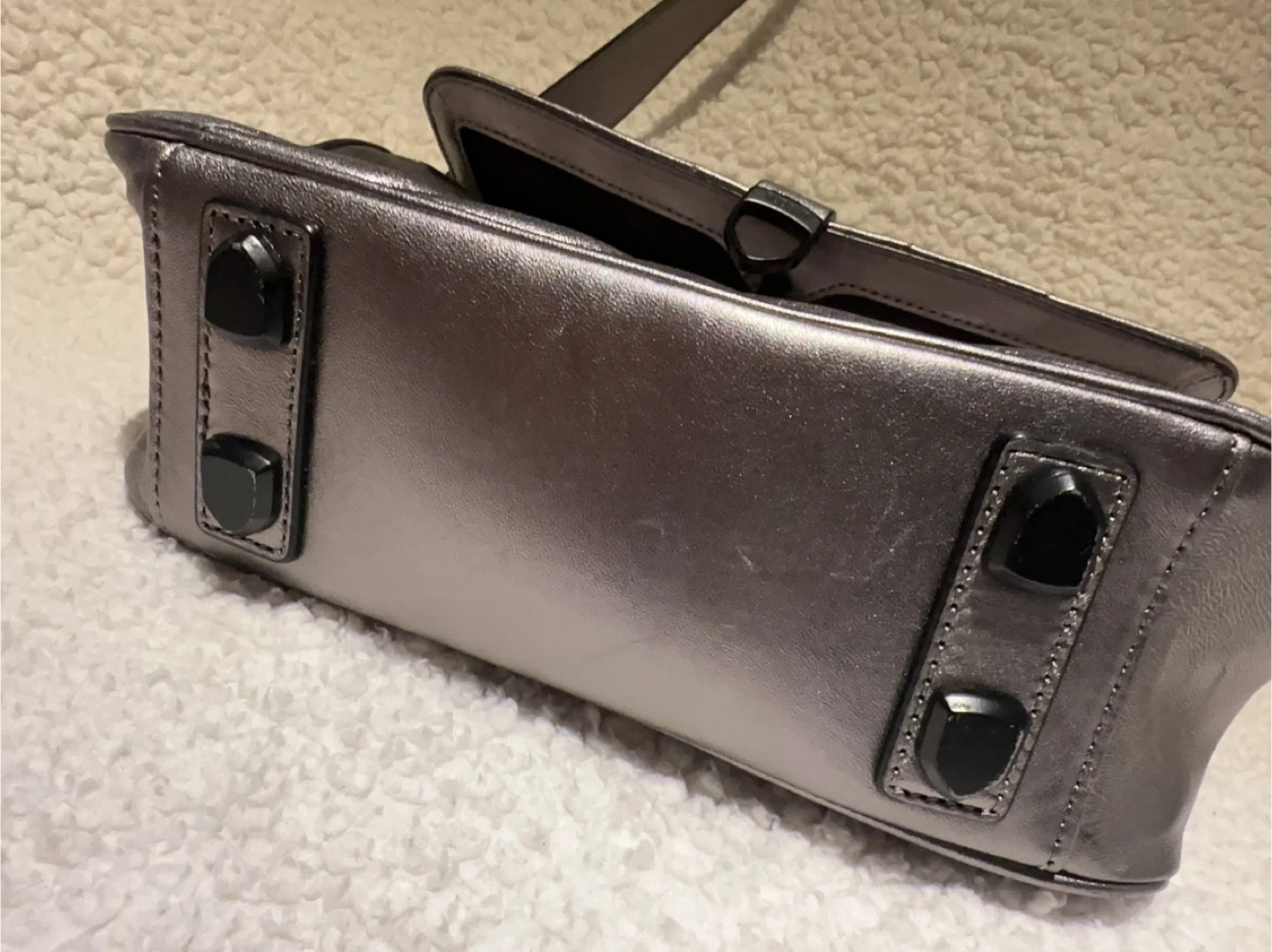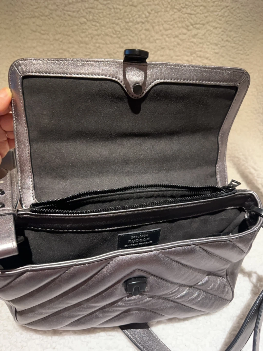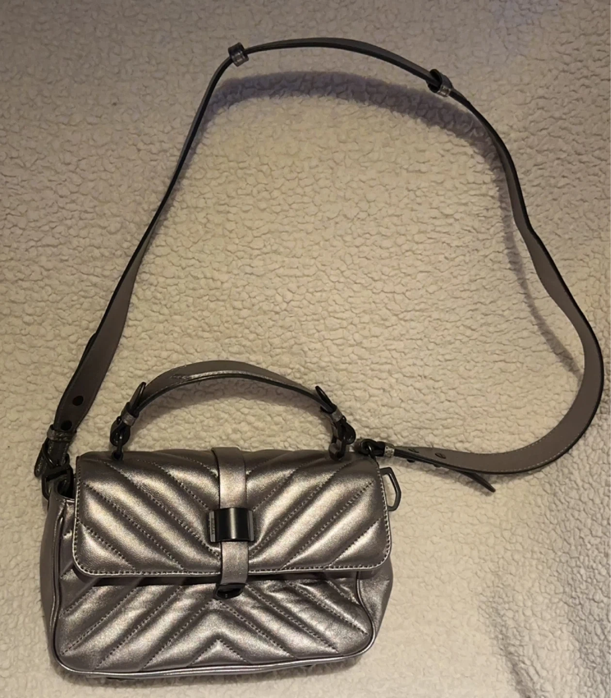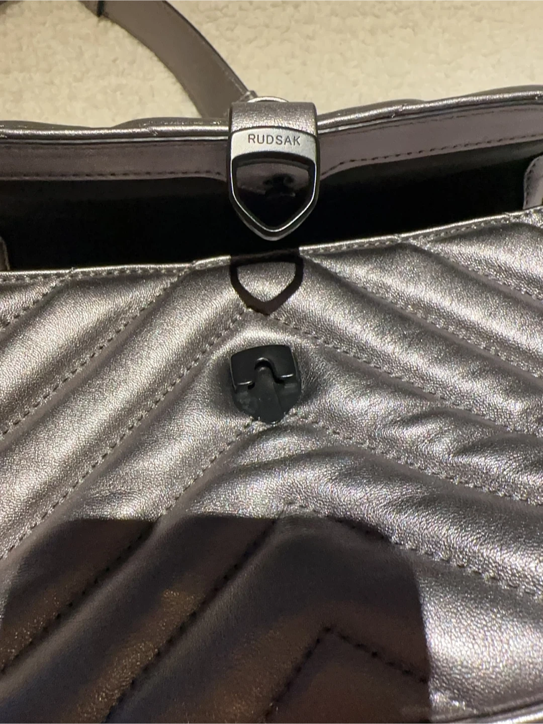 This is a Rudsak crossbody bag with a metallic leather finish. It features a quilted chevron pattern and a secure buckle closure. Inside, you'll find a zippered compartment for extra storage.