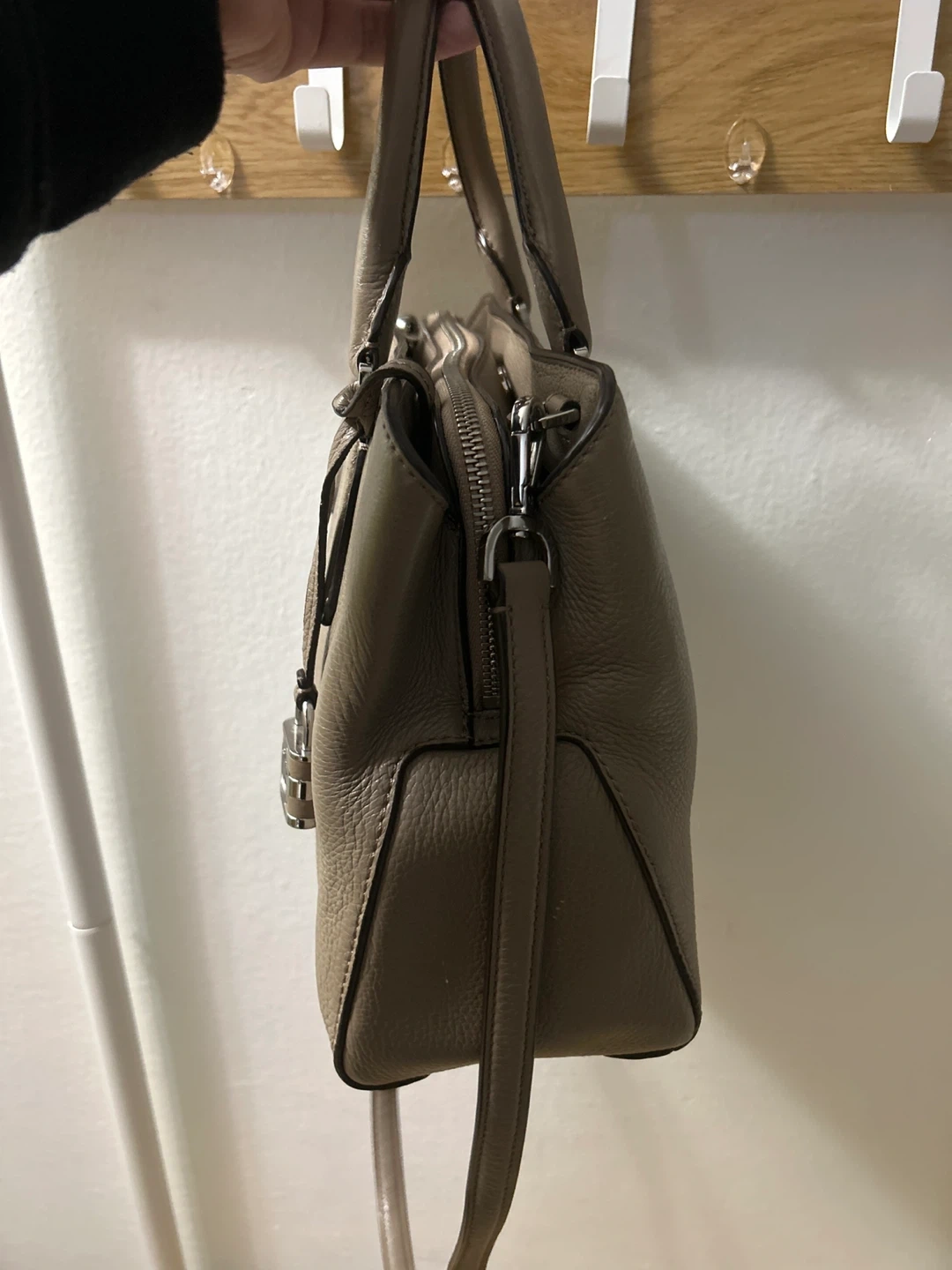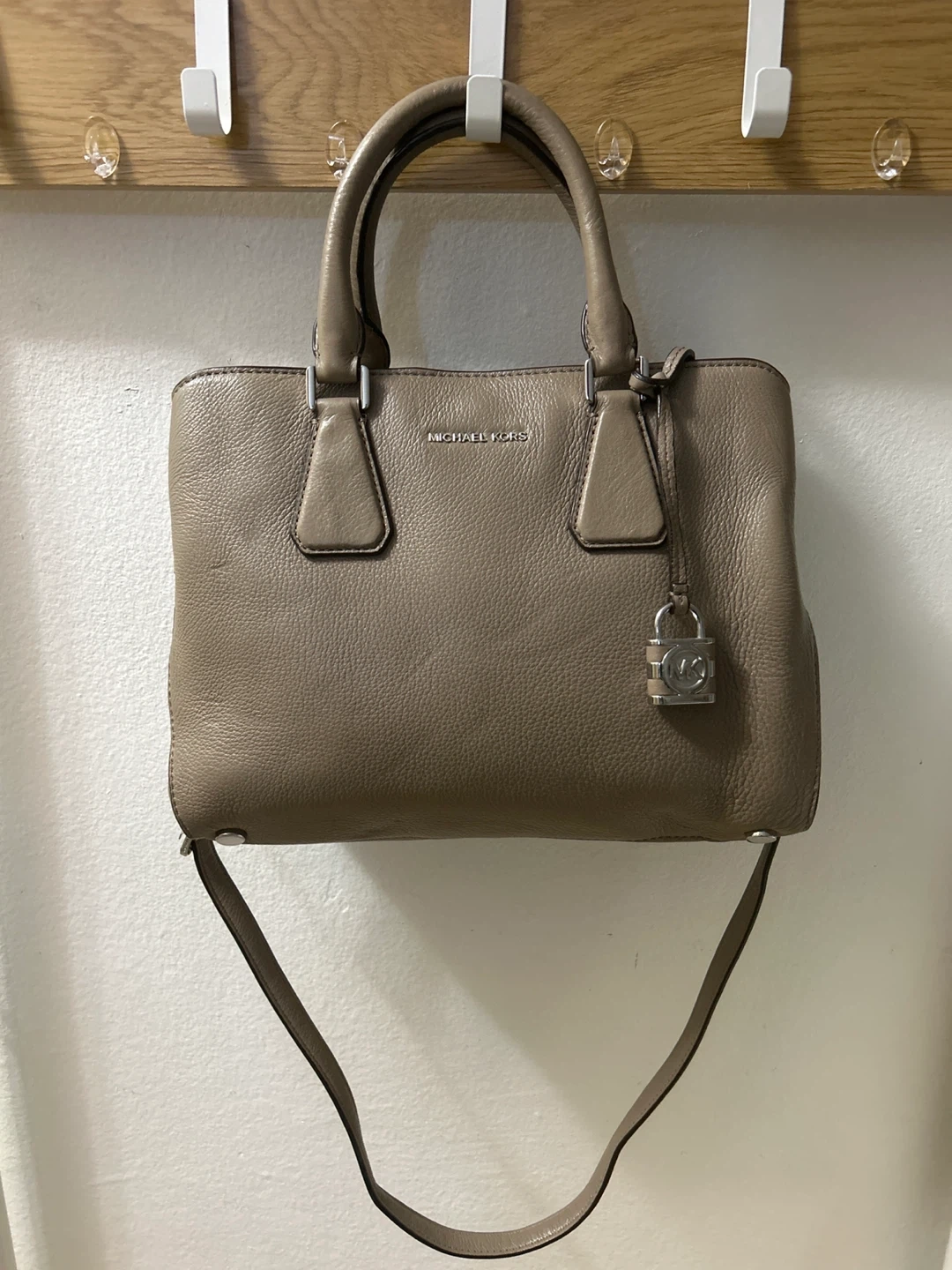 Taupe pebbled leather satchel handbag from Michael Kors. It features top handles and an optional crossbody strap. Zip-top closure with interior pockets.