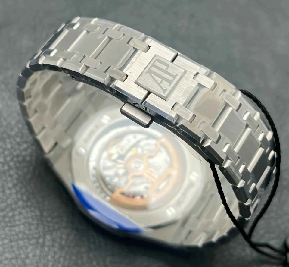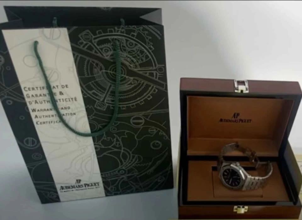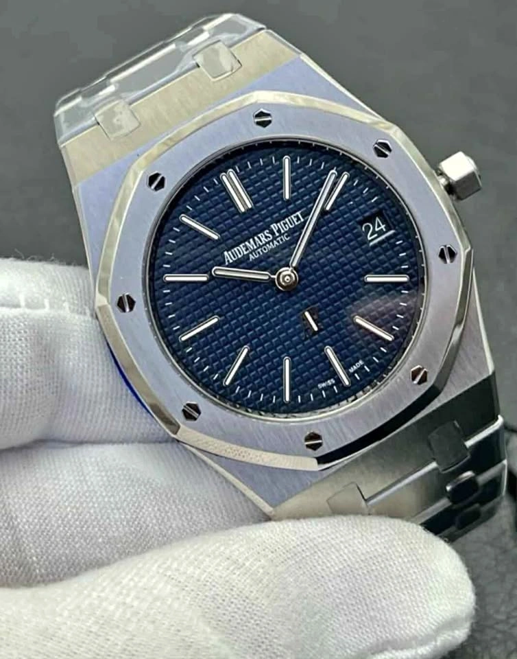 Audemars Piguet Royal Oak Jumbo Extra-Thin Ref. 16202ST.OO.1240ST.02 with Box Bag all included. This "Jumbo" model pays tribute to the original Royal Oak from 1972 with its body of hand-finished steel and its "Bleu Nuit, Nuage 50" “Petite Tapisserie” dial. It houses the latest selfwinding movement, Calibre 7121. Case: Stainless steel case, glareproofed sapphire crystal, and caseback. Size 39 mm Thickness 8.1 mm Water Resistance 50 m Dial: “Bleu nuit nuage 50” dial with “Petite Tapisserie” pattern, white gold applied hour-markers, and Royal Oak hands with luminescent coating. Bracelet: Stainless steel bracelet with AP folding clasp.